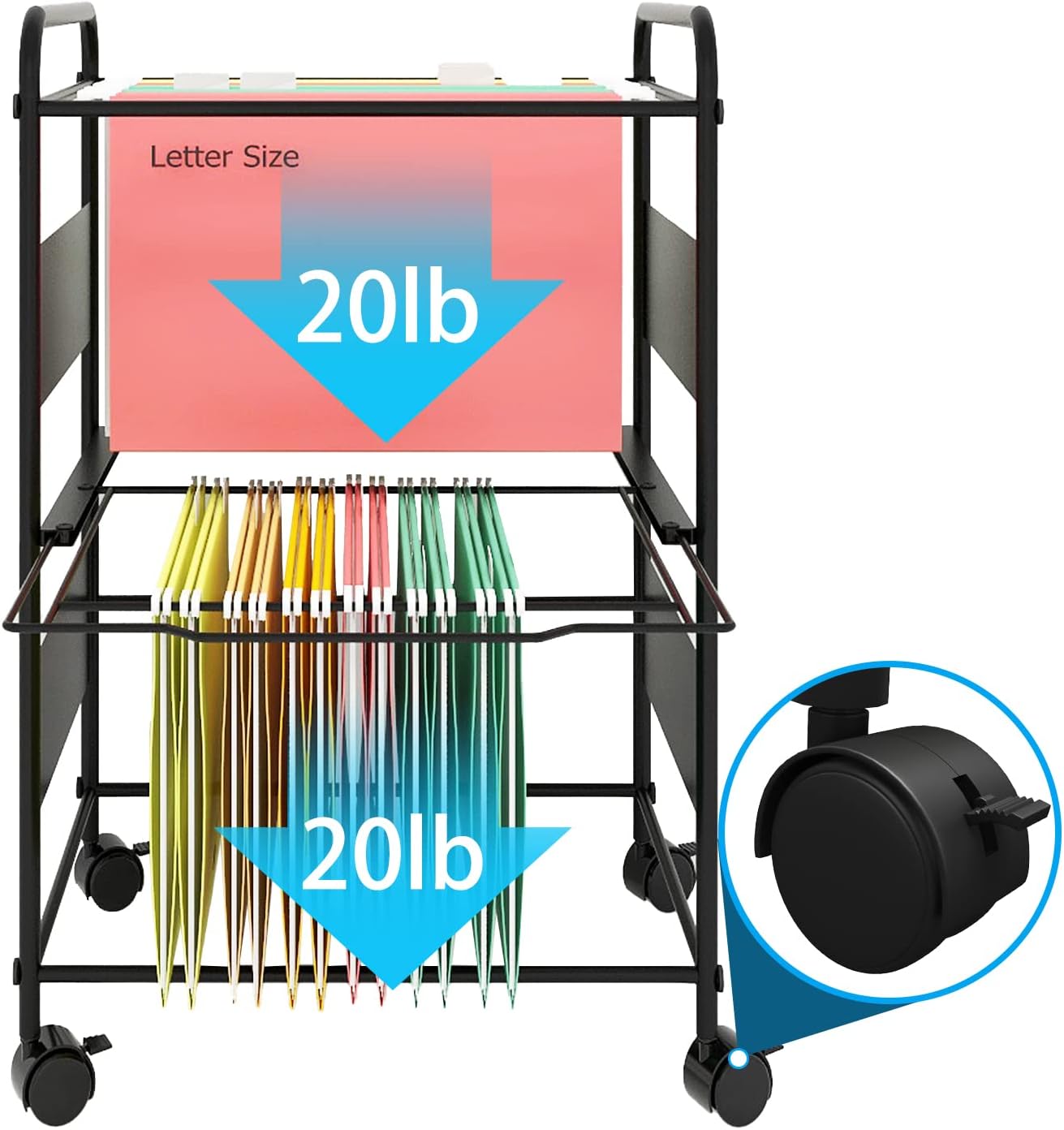 - 【Caster Wheels】With four lockable wheels, the hanging folder cart can be moved everywhere you want in home or office. Also the 360° swivel wheels ensure smooth transportation, and the lockable design help keep stability in one place.