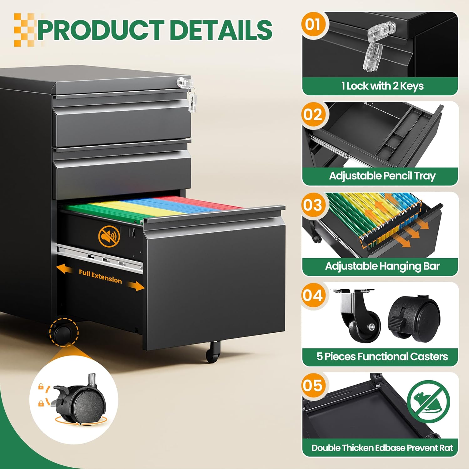 - 【Easy to Move】: The rolling file cabinet is equipped with 4 lockable swivel casters and 1 anti-tilt Caster in front . Middle caster prevents tipping over when all drawers opened at the same time. You can move file cabinet smoothly with 5 rolling casters to anywhere you want.