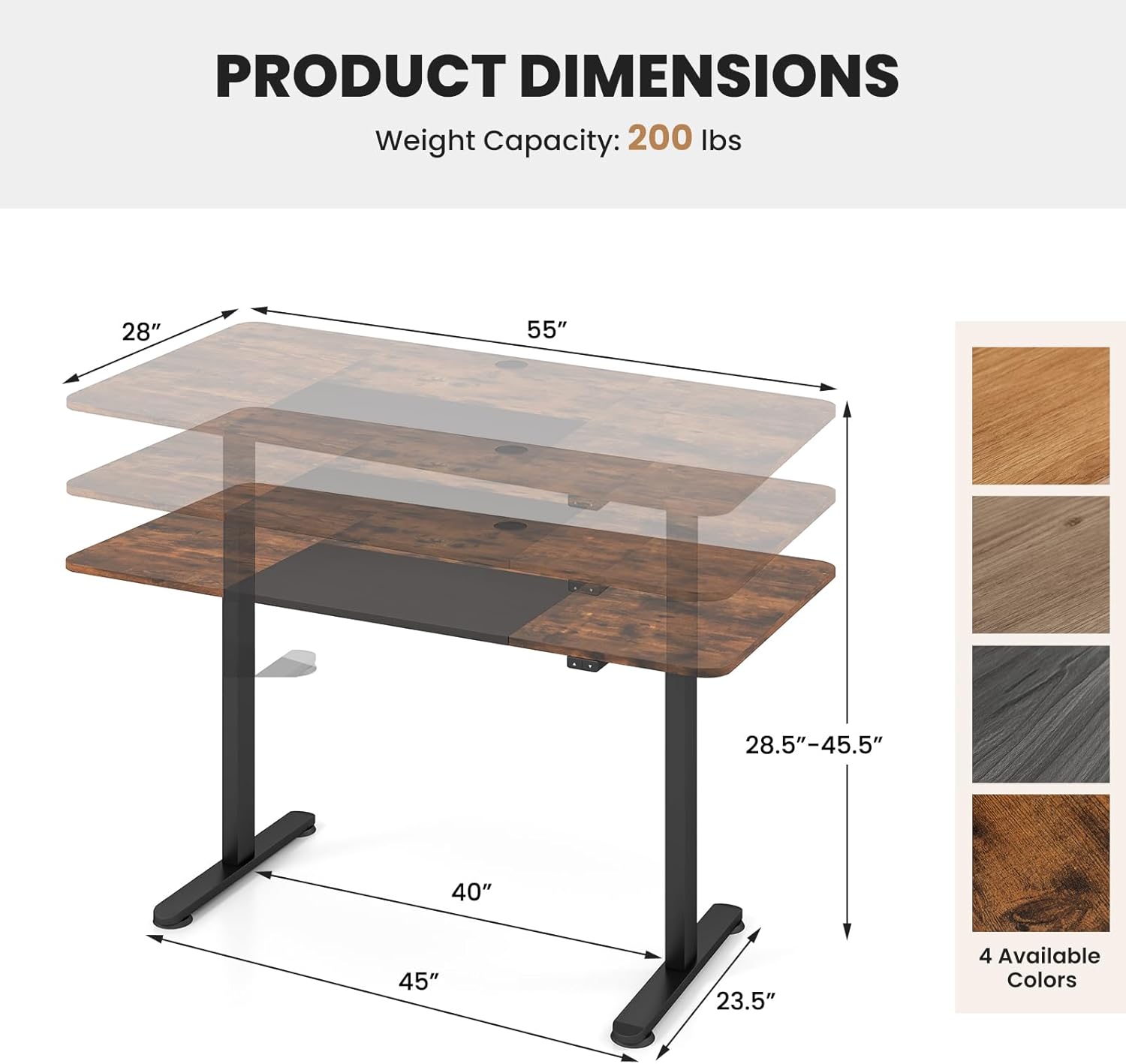 - Make Standing Work Possible: Tired of sitting for long hours? Take a look at this height-adjustable desk. The height of this sit-stand desk can be adjusted between 28.5"-45.5". Just press the control button next to the desk and you can adjust the height of the desk at any time for sitting or standing work.
