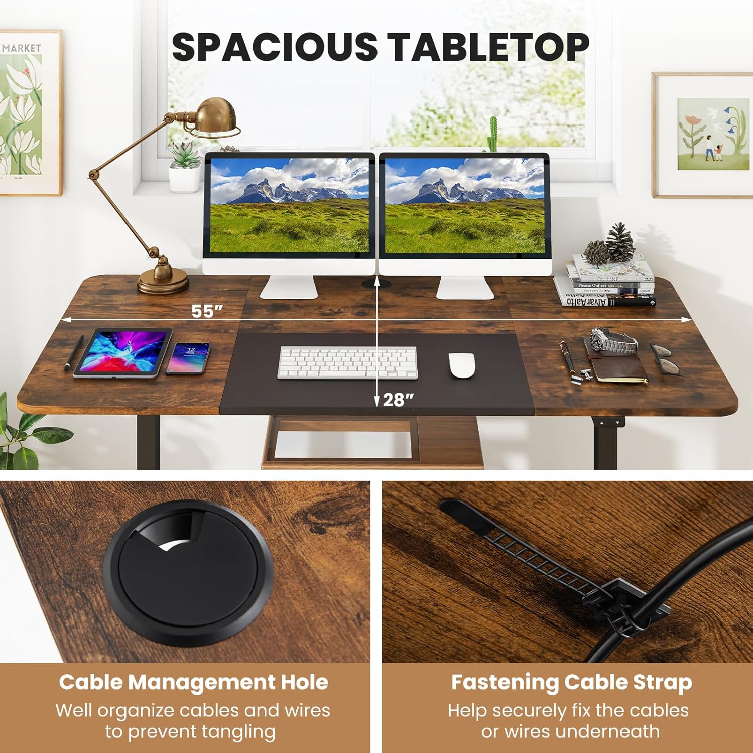 - Spacious Desktop & Complete Accessories: Our stand up desk comes with a spacious 55" x 28" desktop that provides ample space for 2 monitors or laptops. In addition, the standing computer desk comes with a cable hole and a cable bracket to keep your office area neat and tidy.
