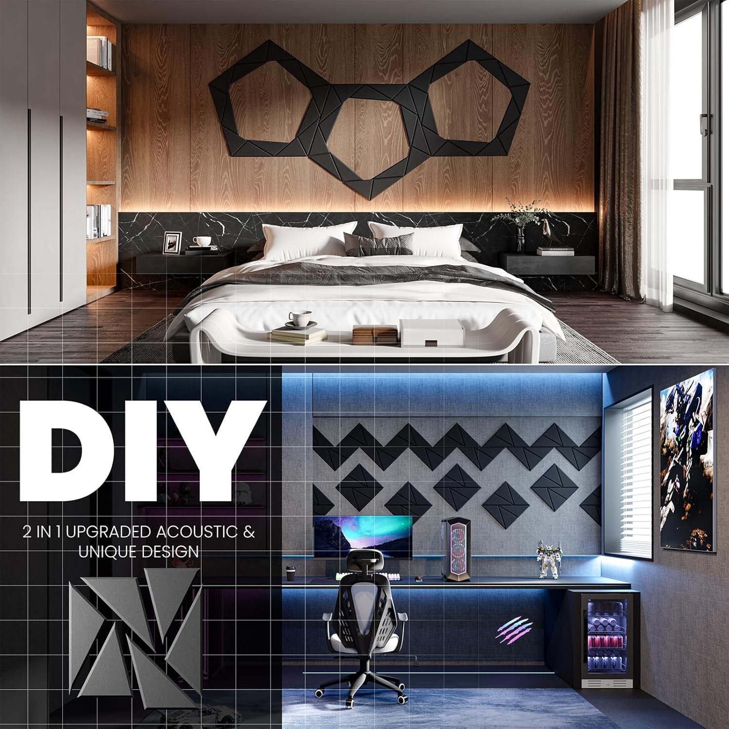 - 👍【Perfect for wall decoration】Be different from other acoustic panels,We have not only upgraded their acoustic performance,but aslo their appearance.Adopt beveled edge and multi-line design.They can be DIY into pinwheel patterns and multi-ring patterns.They absorb unnecessary sound while playing a good role in decorating the wall.Perfect for professional studios, video blogger,game room, podcasting, school,home theaters,offices,etc.