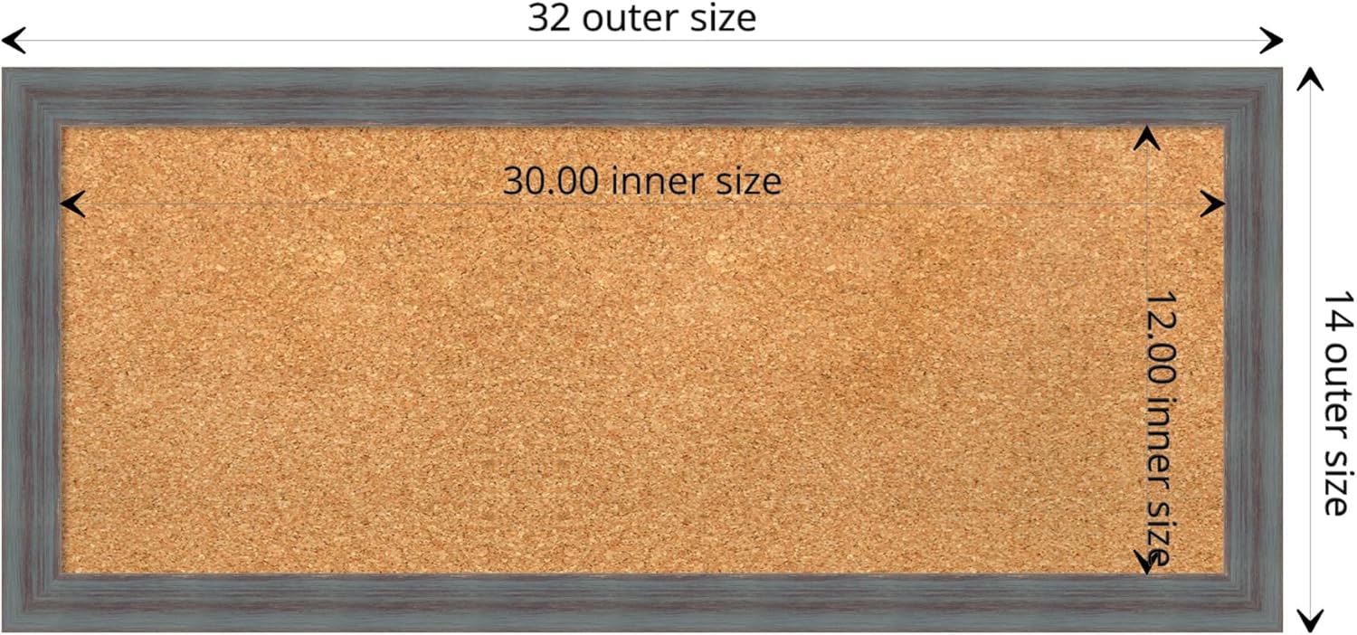 - DIMENSIONS: The overall size of this framed corkboard measures 32 in. x 14 in., including the frame. Its functional cork board area measures 30 in. x 12 in.