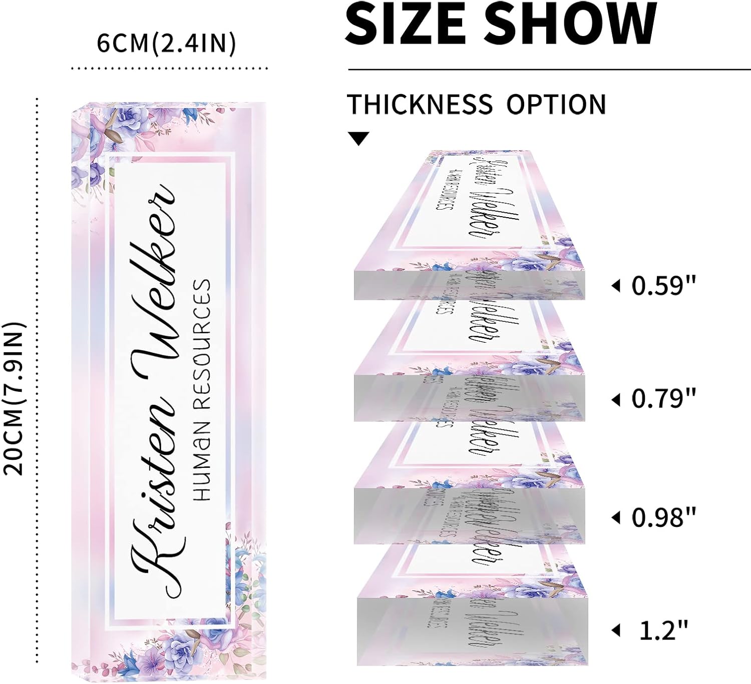 - HIGH QUALITY - The Personalized Name Sign Plates Are Made Of High Quality Crystal Clear Acrylic Blocks. This Office Nameplate Will Stand Out On Any Desk!We use high-tech UV printers to print on quality clear acrylics glass so you can visualise your memories.