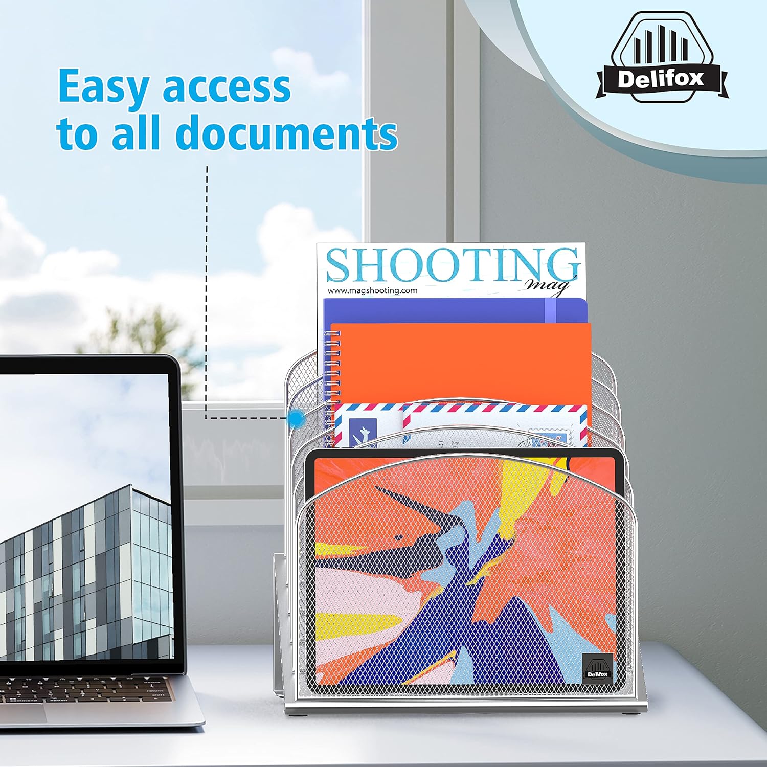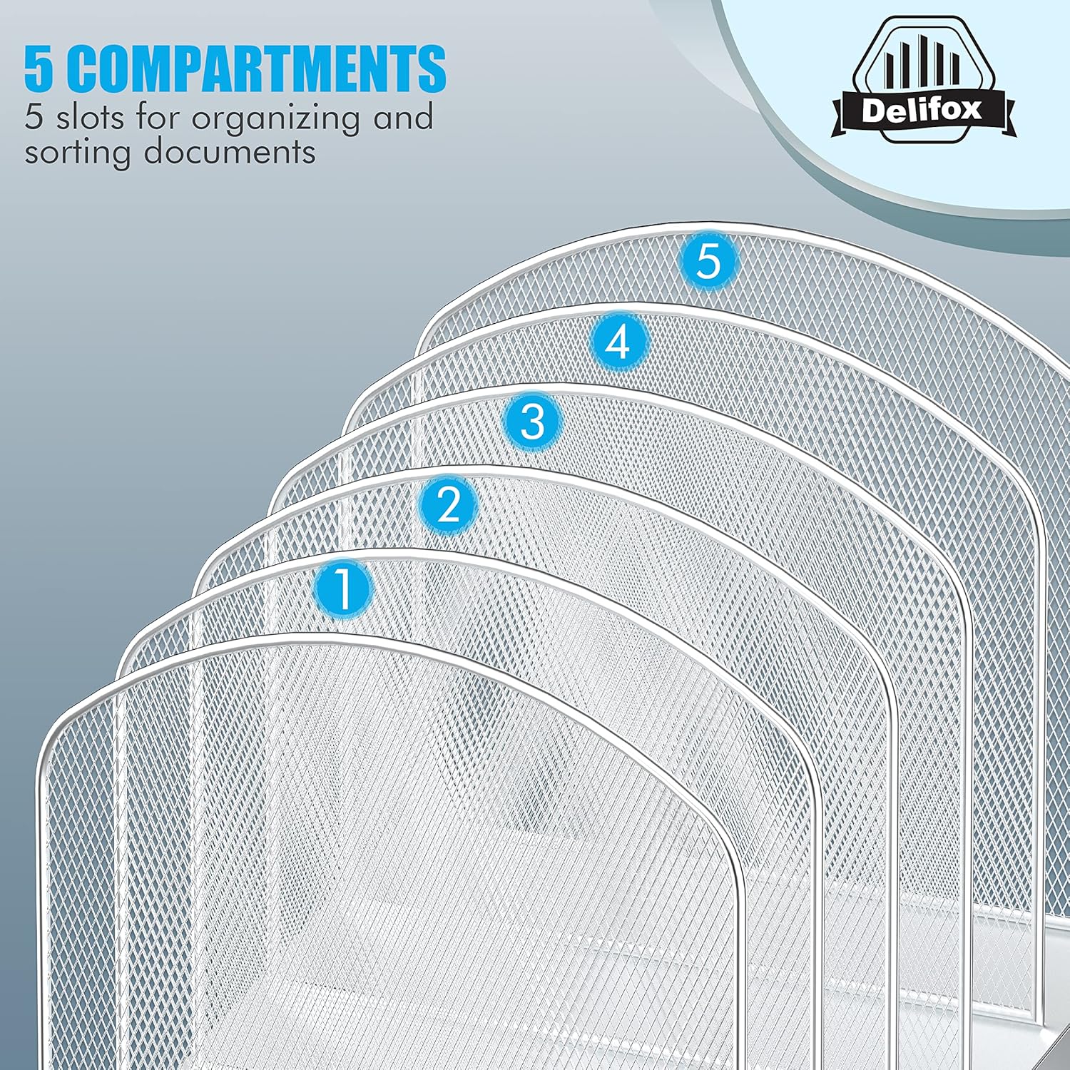 - ▶ SUFFICIENT SPACE FOR STORAGE. Delifox 5-compartment desktop file organizer is large enough to hold and classify many document or papers so as to eliminate worry of document run-off and keep track of files, folders, and other important papers