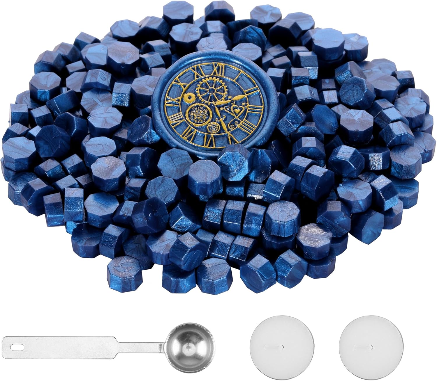 Yoption 300 Pieces Bright Blue Sealing Wax Beads, Vintage Octagon Seal Beads With 4 Candles and 2 Melting Spoons for Wax Stamp (Bright Blue)