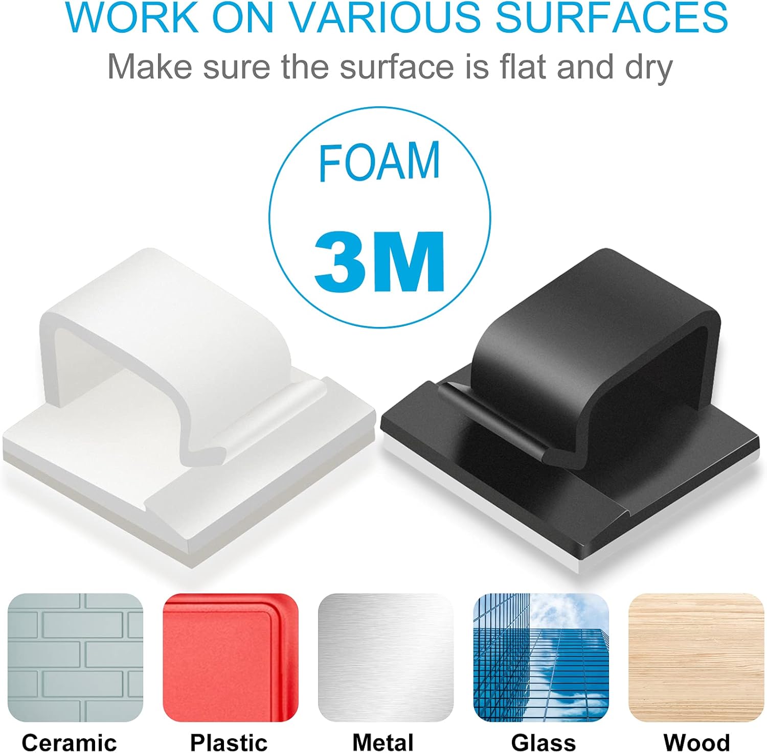 - 100 PCS: Our package includes 50 pcs black cable clips, 50 pcs white cable clips. Made of eco-friendly premium PA66 material, our adhesive wire clips are sturdy and durable.