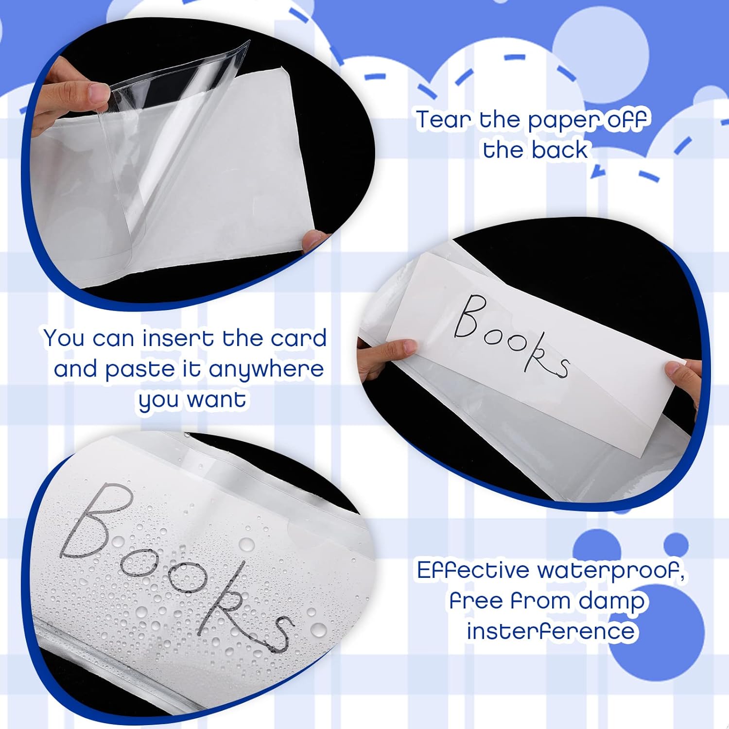 - Stay Organized: the self adhesive index card pocket can keep order by inserting your cards into plastic sleeves and attaching them wherever you need them; Our self-adhesive cards are suitable for making library labels, self adhesive name tags for classroom, toy labels for bins with pictures, labels for plastic storage bins and other
