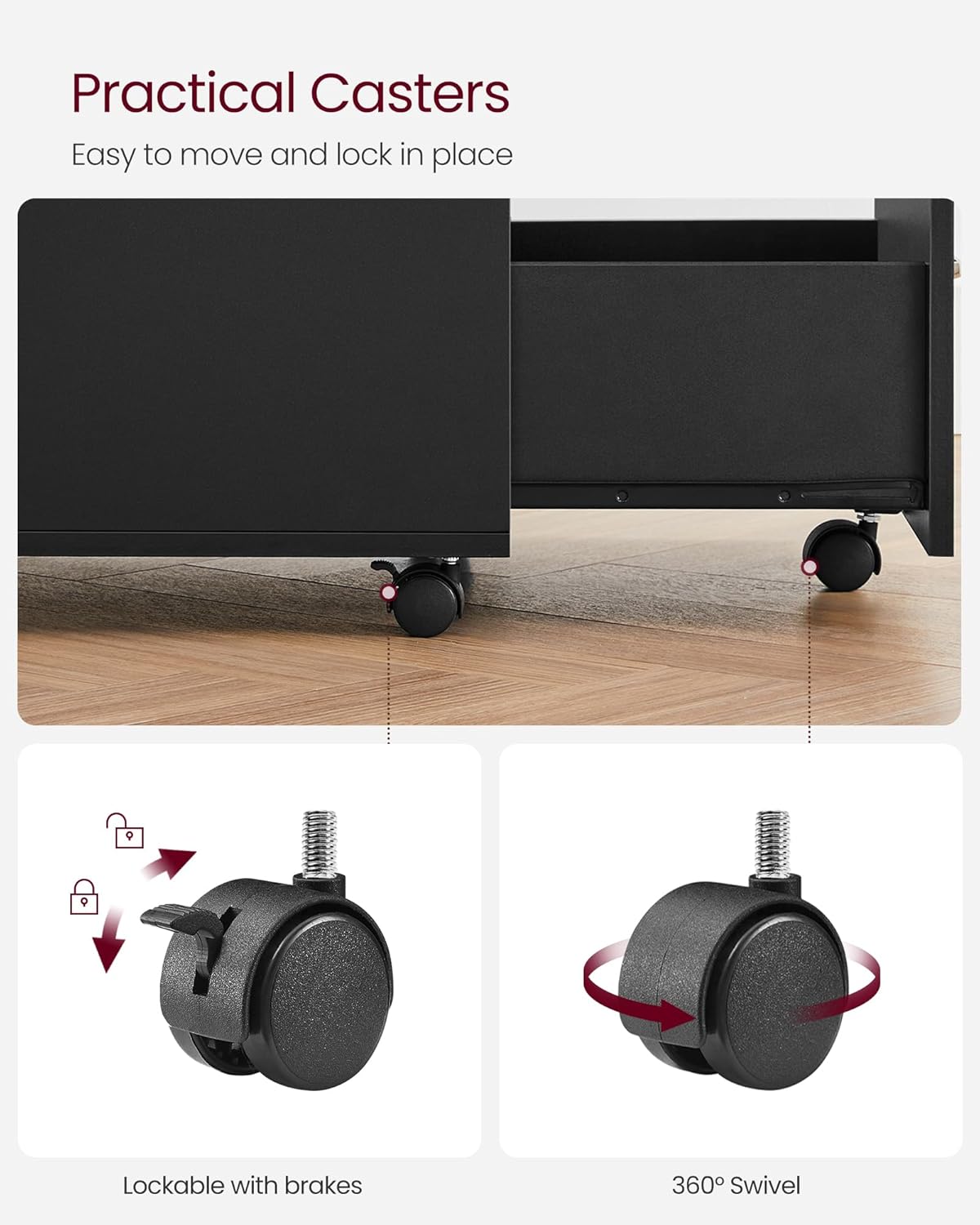 - [Lockable, 360° Swivel Wheels] Five 360° swivel wheels allow you to move this filing cabinet around with ease. The 2 front wheels are lockable to keep the cabinet in place when stationary and the fifth wheel on the bottom drawer adds to overall stability