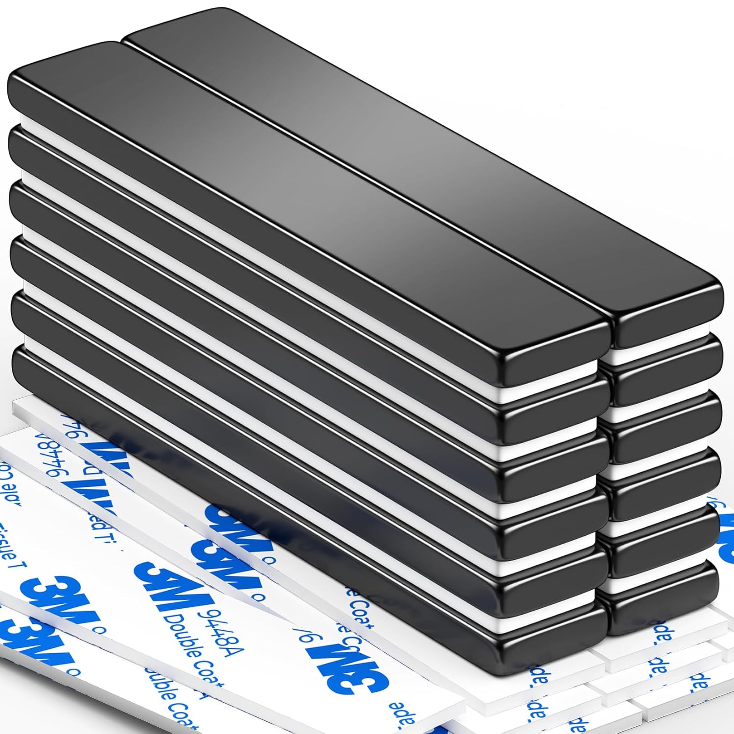 - 【Magnet size】 — Strong neodymium magnet size 60 mm × 10 mm × 3 mm with 12 sheets of adhesive film, you can stick these double-sided adhesives to one side of the magnets, then these magnets can be easily used on non-magnetic surfaces!