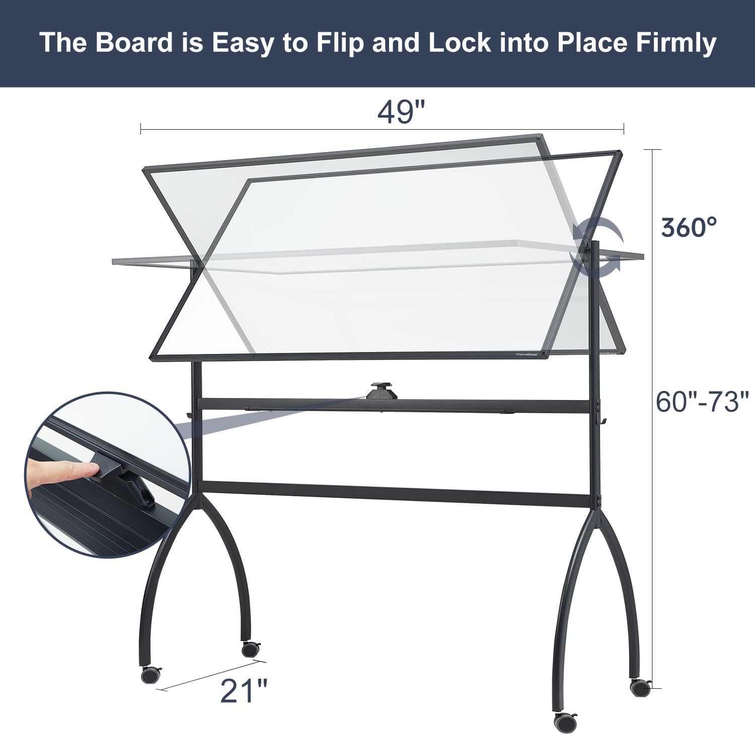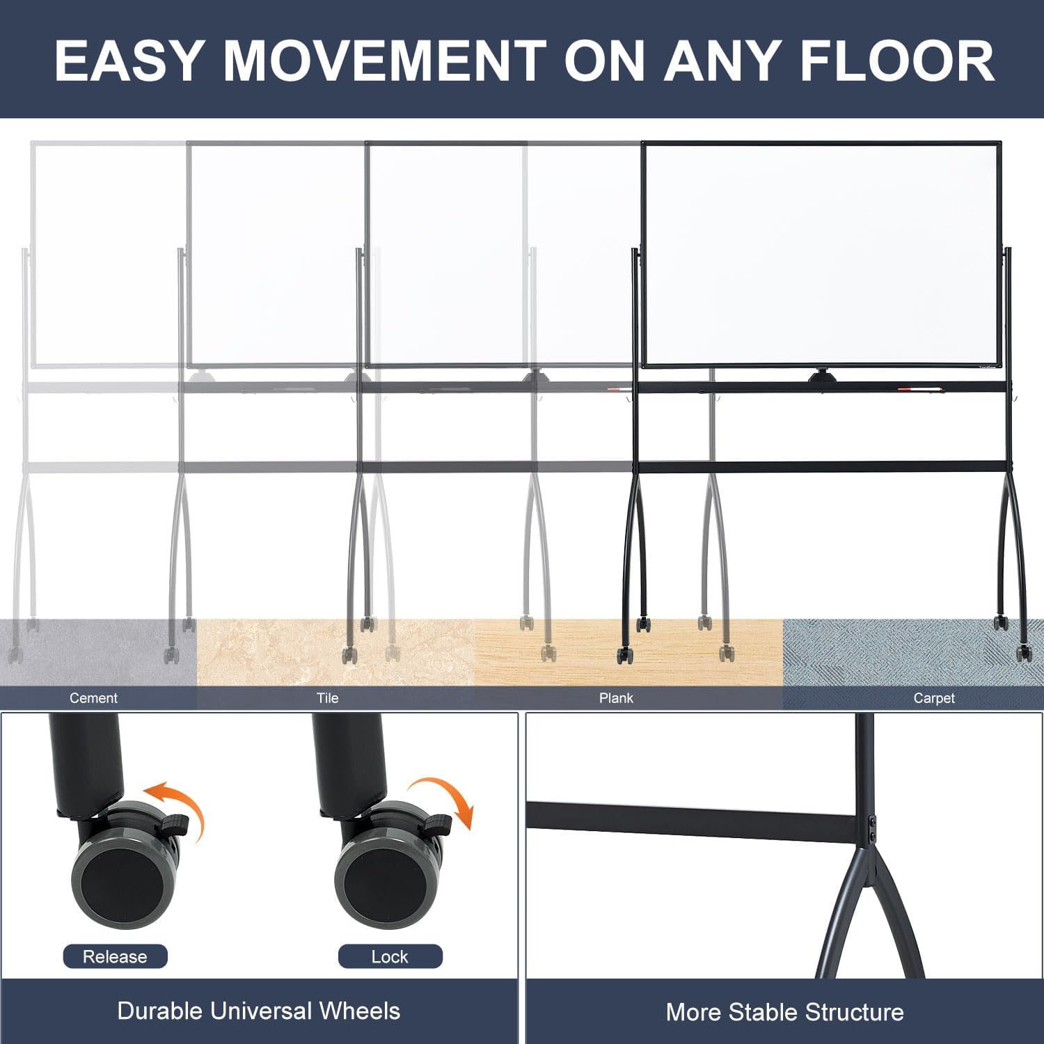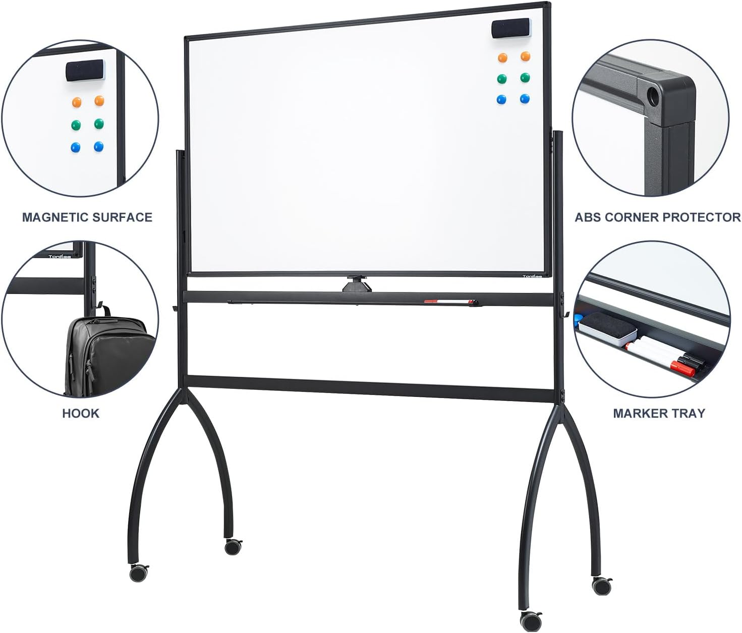 - DOUBLE-SIDED DESIGN - The reversible double-sided whiteboard gives you plenty of writing space, while the board stopper ensures that the mobile white board stays firmly in place during use, preventing it from moving or wobbling. A must-have for presentations, brainstorming sessions, group discussions and lectures.