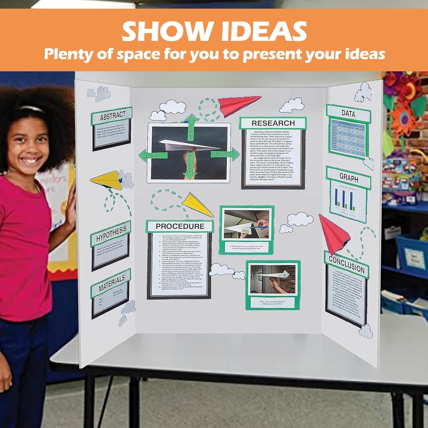 - What's Included: You'll get 8 trifold poster boards with corresponding card headers, 8 sheets self adhesive poster board titles, and 64 sheets black edge science project stickers to make your display more clear, a very practical product with enough quantity to meet your daily needs