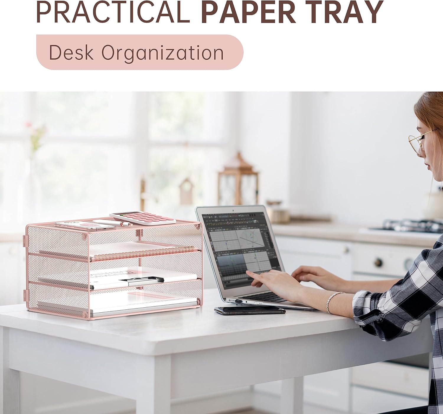 DALTACK 3 Tier Letter Tray Paper Organizer Mesh Metal Desk File Organizer for Home & Office, Pink