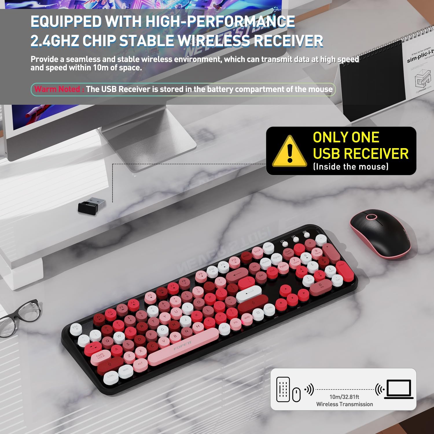 - Cute Wireless Keyboard - Stable 2.4G Wireless Connection : Enjoy a powerful wireless connection with a range of up to 10 meters (393.7 inches) for the keyboard and mouse combo. They utilize a shared Nano receiver, conveniently stored at the bottom of the mouse, Plug and Play.eliminating the need for additional software installation.keeping your desk clean.Keyboard size 17.5 x 5.5 x 1.3 inch With 105 Keys. Mouse size is 4.1 x 2.5 x 1.0 inch. Keyboard net weight: 1.57LB,Mouse net weight: 0.15LB.