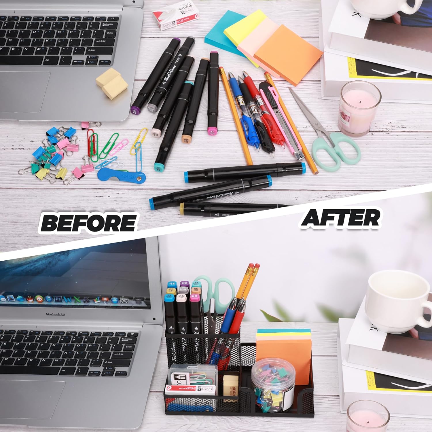 - Space Saving:3 Compartments Black Mesh Pencil Holder organizer compartments let you separate pens,scissors,rulers,glue sticks and binder clips, sticky notes and sticker dots, tacks.