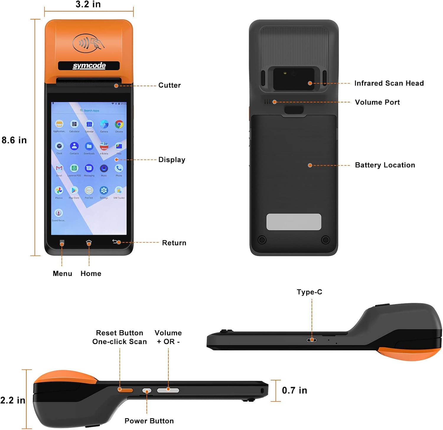 symcode POS PDA Thermal Receipt Printer,1D 2D Barcode Scanner Handheld PDA Printer Mobile POS Machine 5.5" Touch Screen 58mm Thermal Printer Android 8.1 Support 4G WiFi Bluetooth and NFC