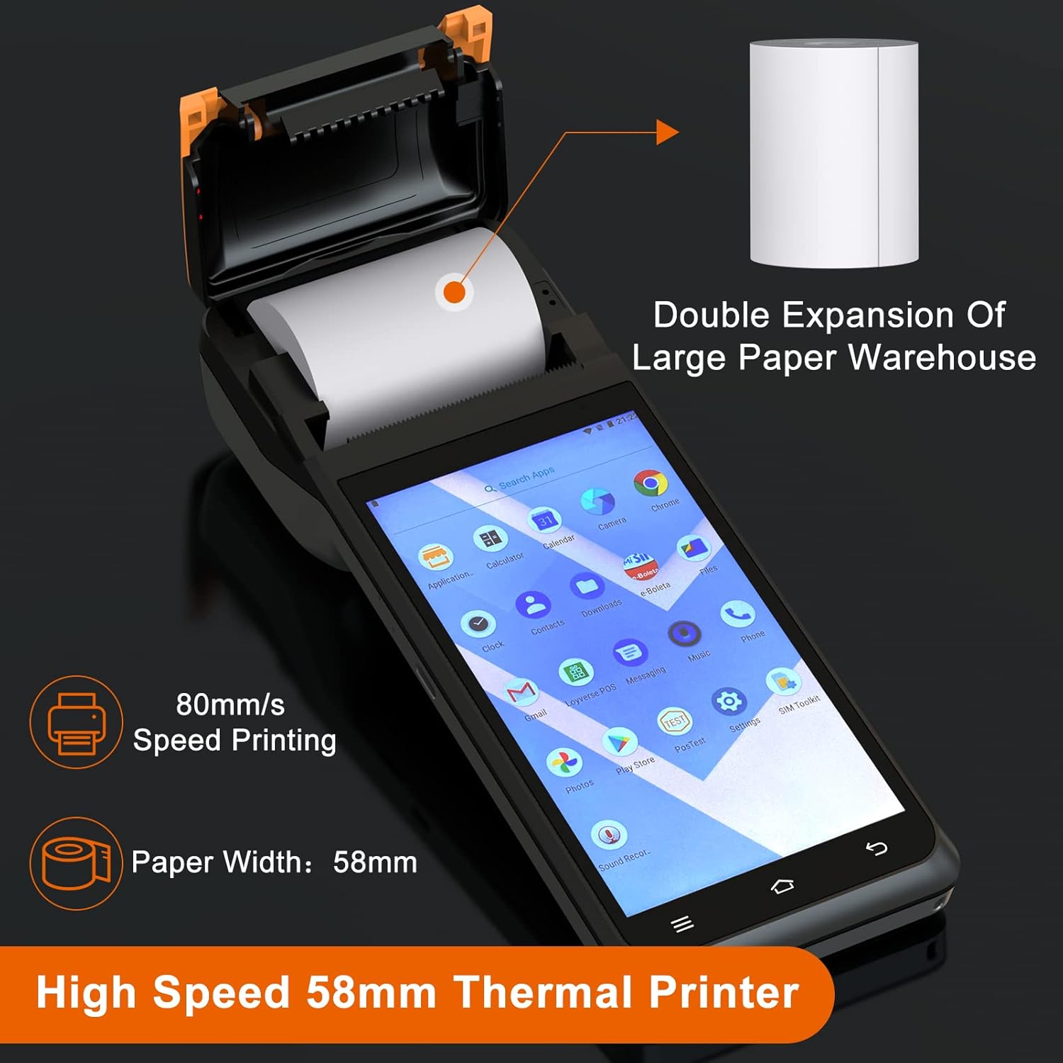- 58mm POS Thermal Receipt Printer Android 8.1 OS Touch Screen, 40MM Diameter Paper Roll Capacity, Support 3G/4G/5G, Wi-Fi Network, Bluetooth , Compatible with 98% of Android Apps ,Support Nano SIM+TF , With NFC card recognition.