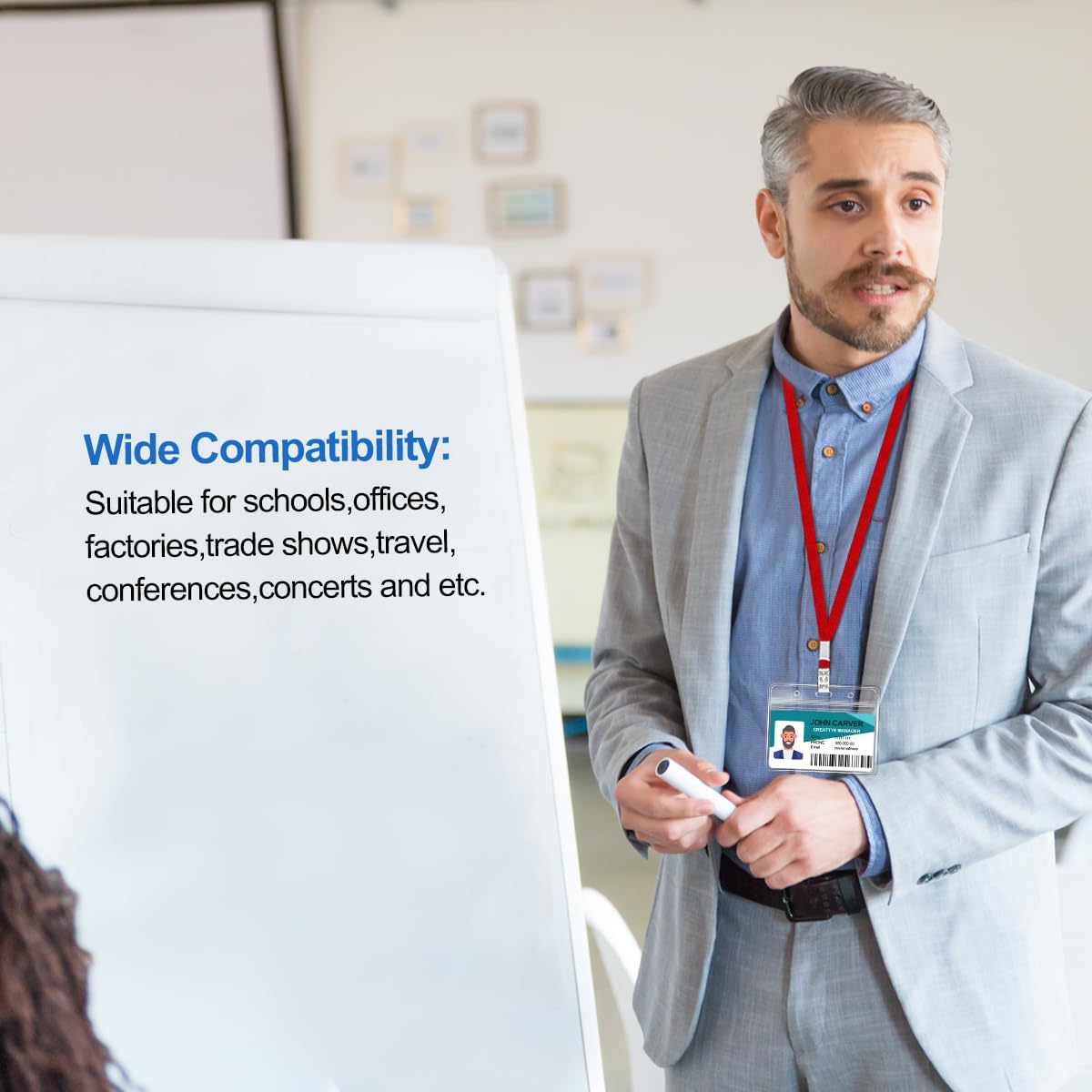- Value Pack: Each set includes 100 pieces of clear ID card holders and 100 pieces of neck lanyards - giving you enough quantity for all your needs. The lanyard is approximately 17.7 inches in length, providing ample length for comfortable wearing