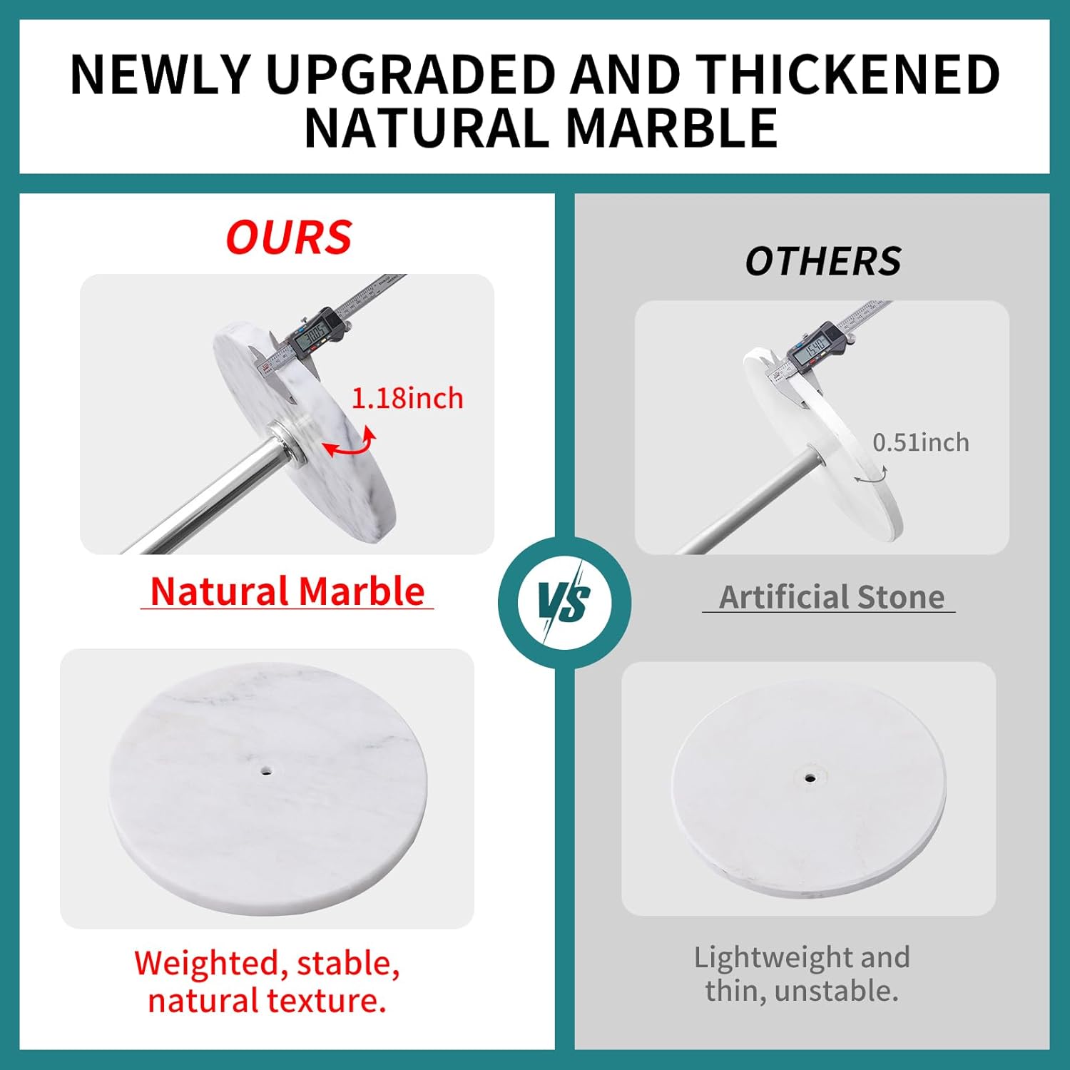 - THICKENED NATURAL MARBLE BASE: OIRUMIE coat rack base stand is made of 100% natural marble. The diameter of the marble is 11.81 inches, The thickness of the marble is 1.18 inches, which is stable and not shaking. The coat racks are convenient for storage and easy to clean