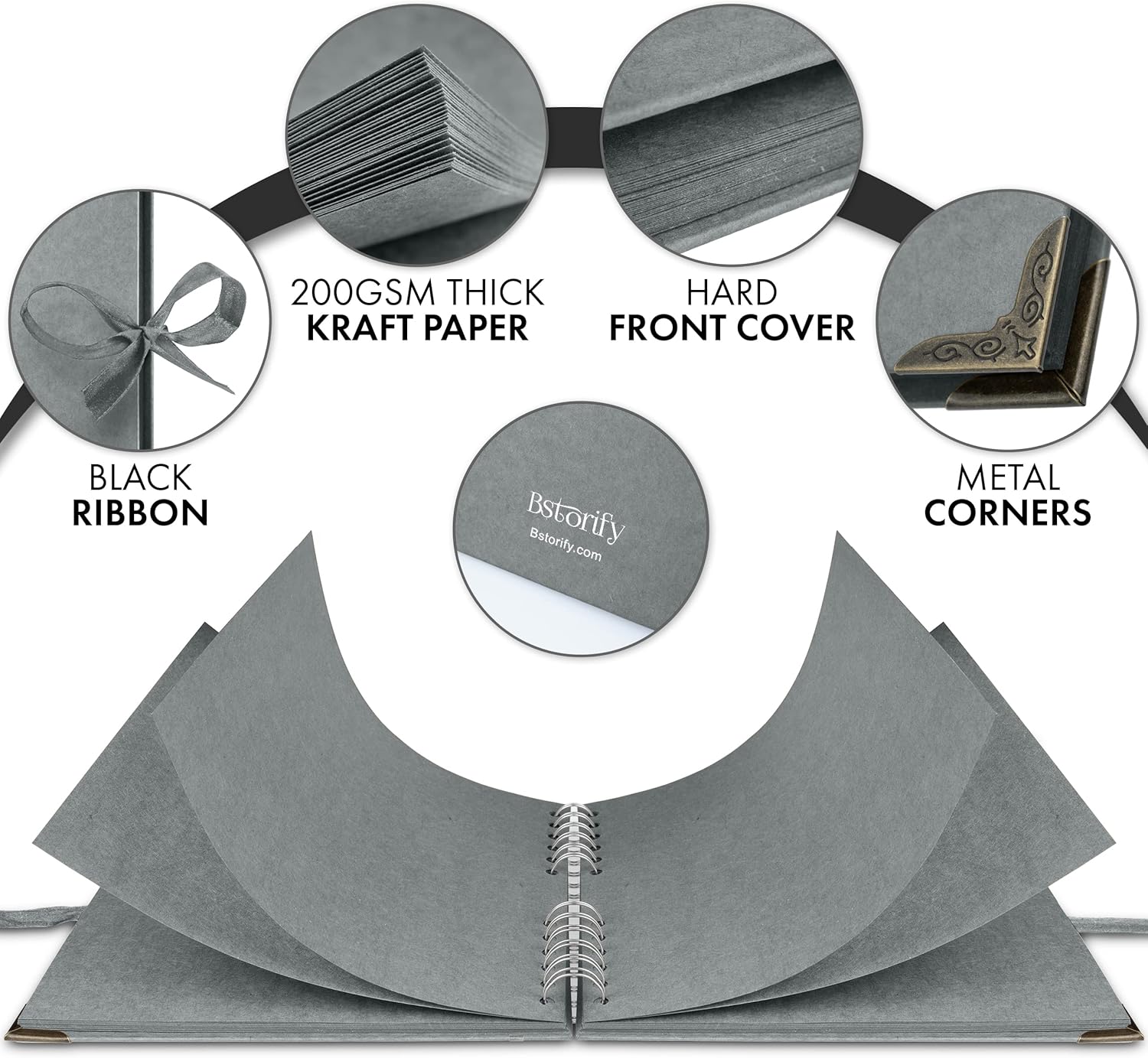 Bstorify Square Scrapbook Photo Albums 60 Pages (21 x 21 Cm) Grey Thick Paper, Hardcover, Metal Corners, Ribbon Closure - Ideal for Your Scrapbooking Albums, Art & Craft Projects (Grey, 21 x 21 Cm)