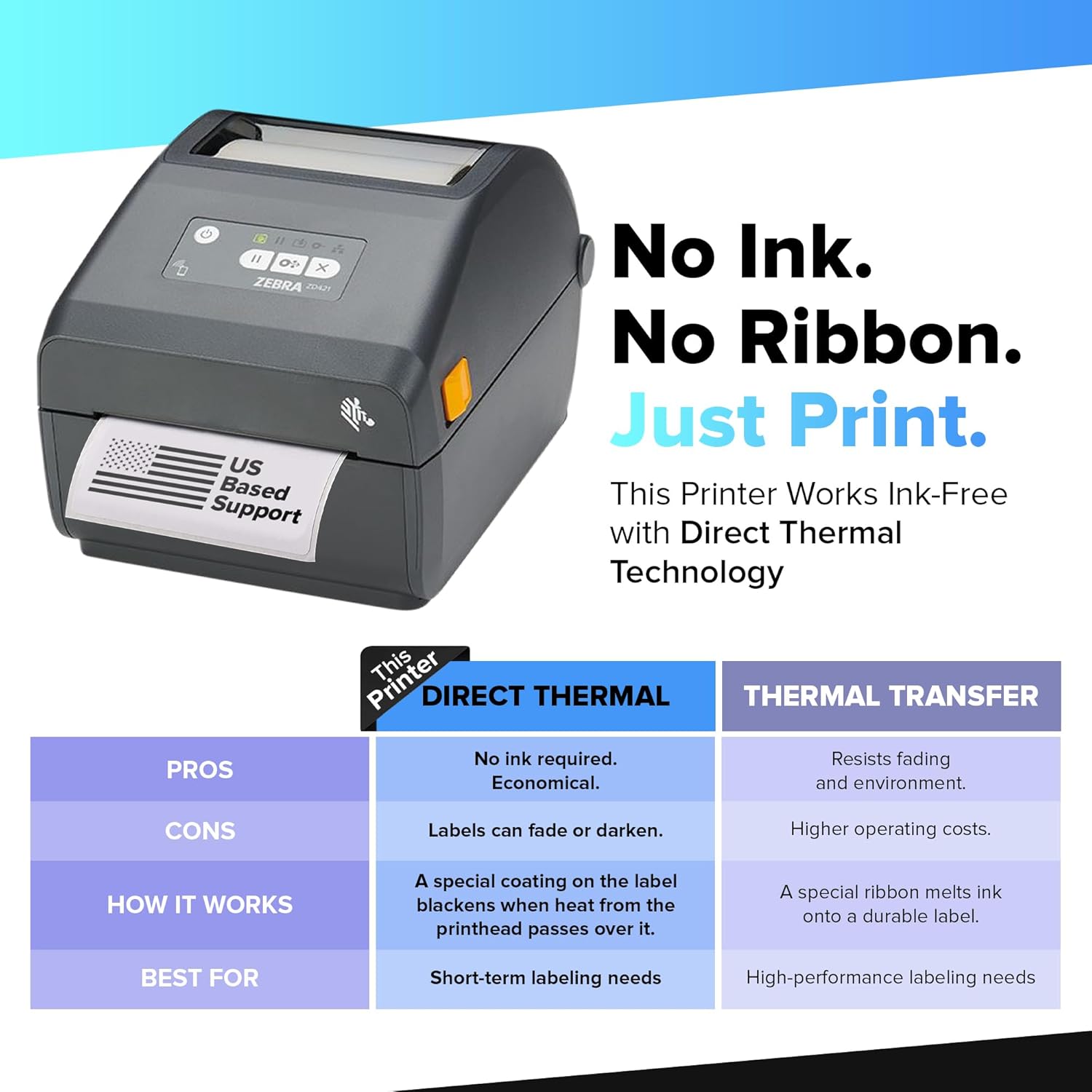 Zebra ZD421 Direct Thermal USB 203 dpi | ZD4A042-D01M00EZ 4 inch Width | No Thermal Ribbon Required