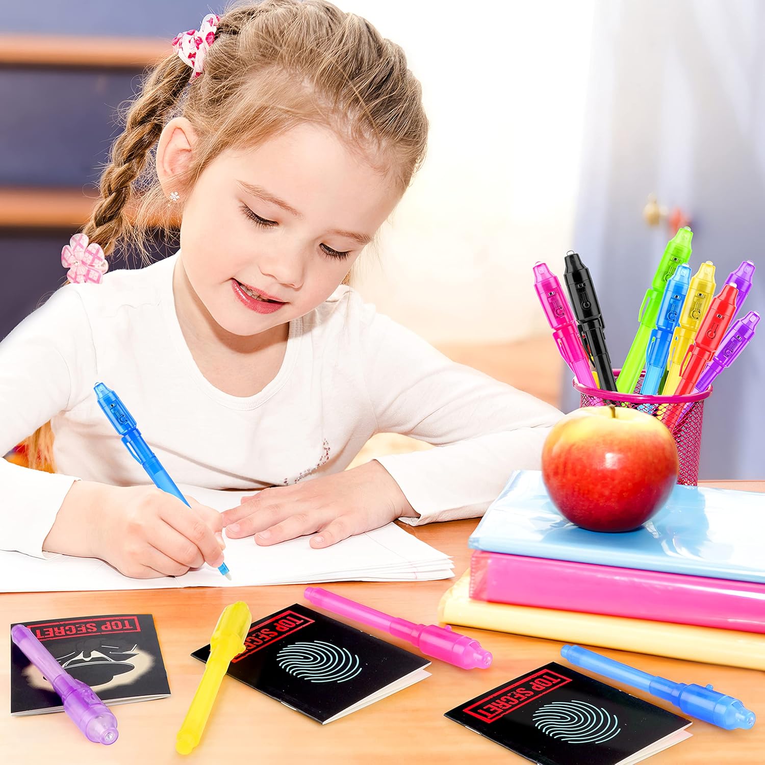 - Creative Invisible Ink Pen - Elevate your kids' creativity and fun with this amazing invisible ink pen! Kids can write their secret messages on paper using this magic pen, which can only be discovered by shining the pen's UV light on them! This spy pen set is the perfect addition to your child's spy games at home, providing countless moments of fun and imagination.