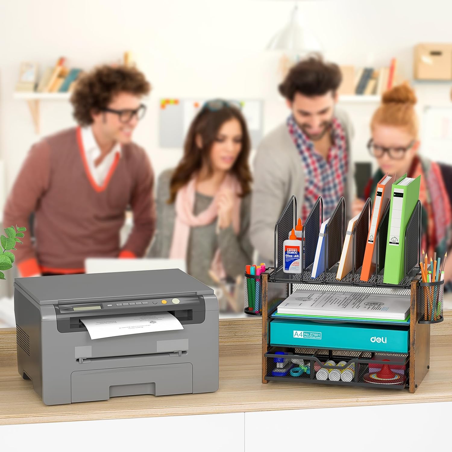 4-Tier Mesh Desk Organizer, Wooden Desk File Organizer with 5 Vertical File Holders and 2 Pen Holders, Desktop Organizers and Accessories with Drawer for Home Office