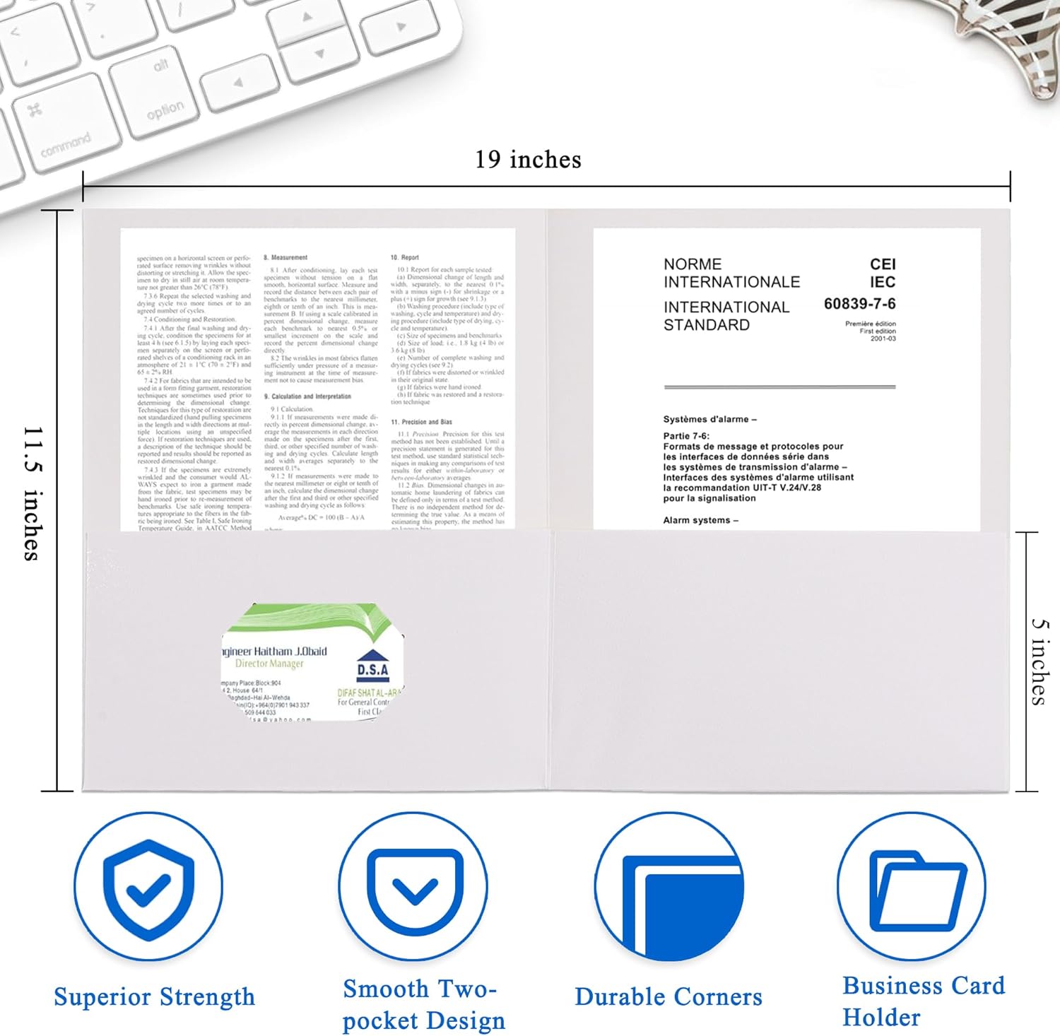 - Professional Design:Two pockets provide storage space for paper,brochures,and more,Each folders for documents measures 9" x 11.5",with two 5" pockets,holds (over 100) sheets of paper,and has a universal business card holder on the right pocket.
