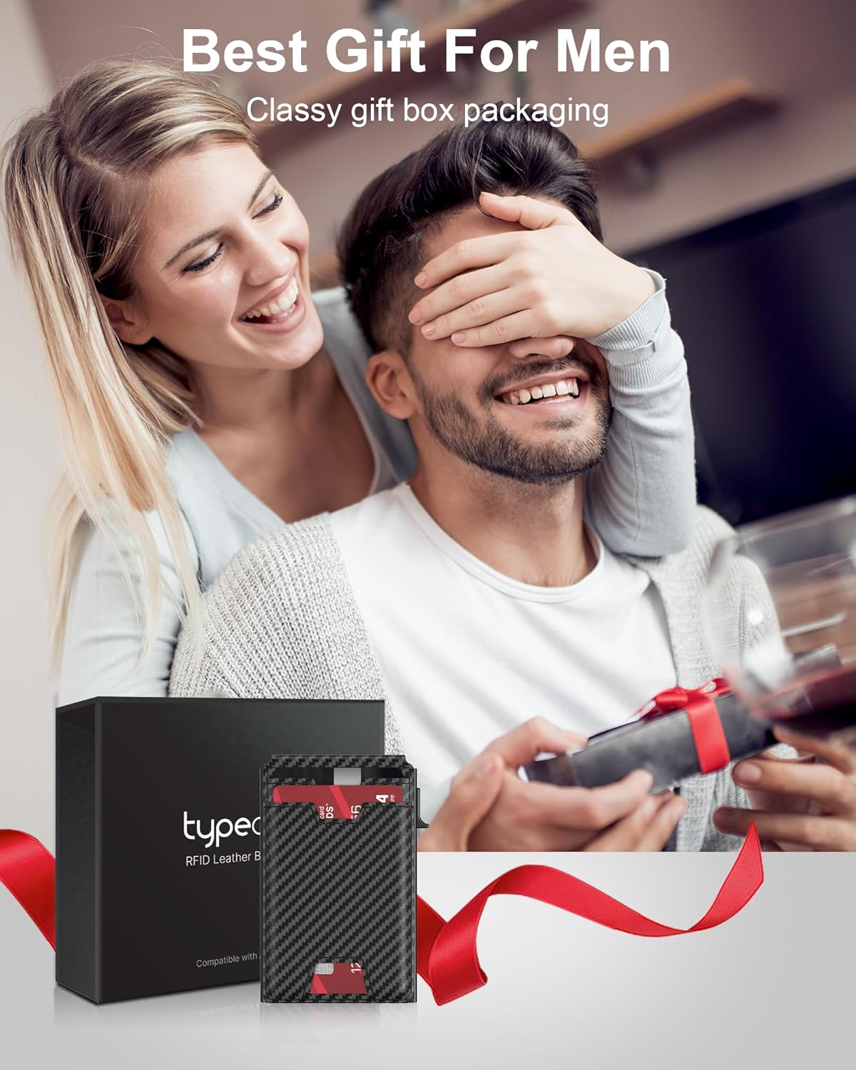 typecase Mens Wallet Card Holder: Pop Up Card Case, Genuine Leather, RFID Blocking, Smart, Slim, Minimalist, Thin - 13 Card Capacitiy, ID Window, Cash Strap (Carbon Fiber)