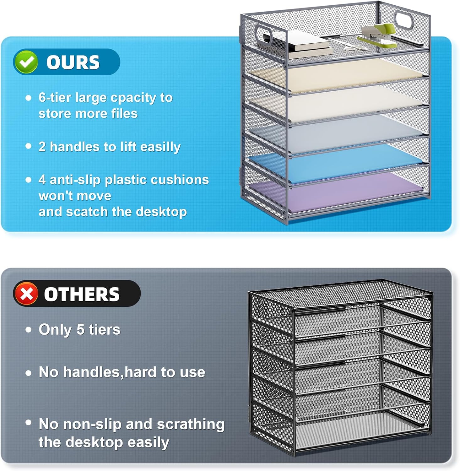 - 【HIGH QUALITY】The mesh desk file organizer is made of lightweight durable metal mesh and reinforced with a solid steel frame that makes it have long-lasting strength and reliable performance