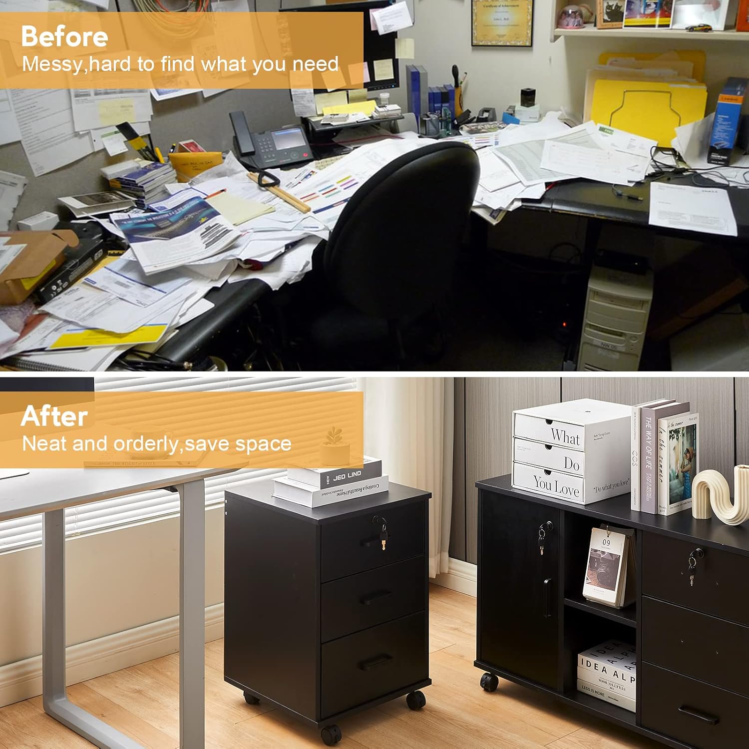 TUKAILAi Mobile File Cabinet with 3 Drawers, Lockable Storage Unit Wooden Rolling Office Filing Cabinet with Wheels, for Legal/Letter/A4 Sized Documents Home Office (Black 2PCS)
