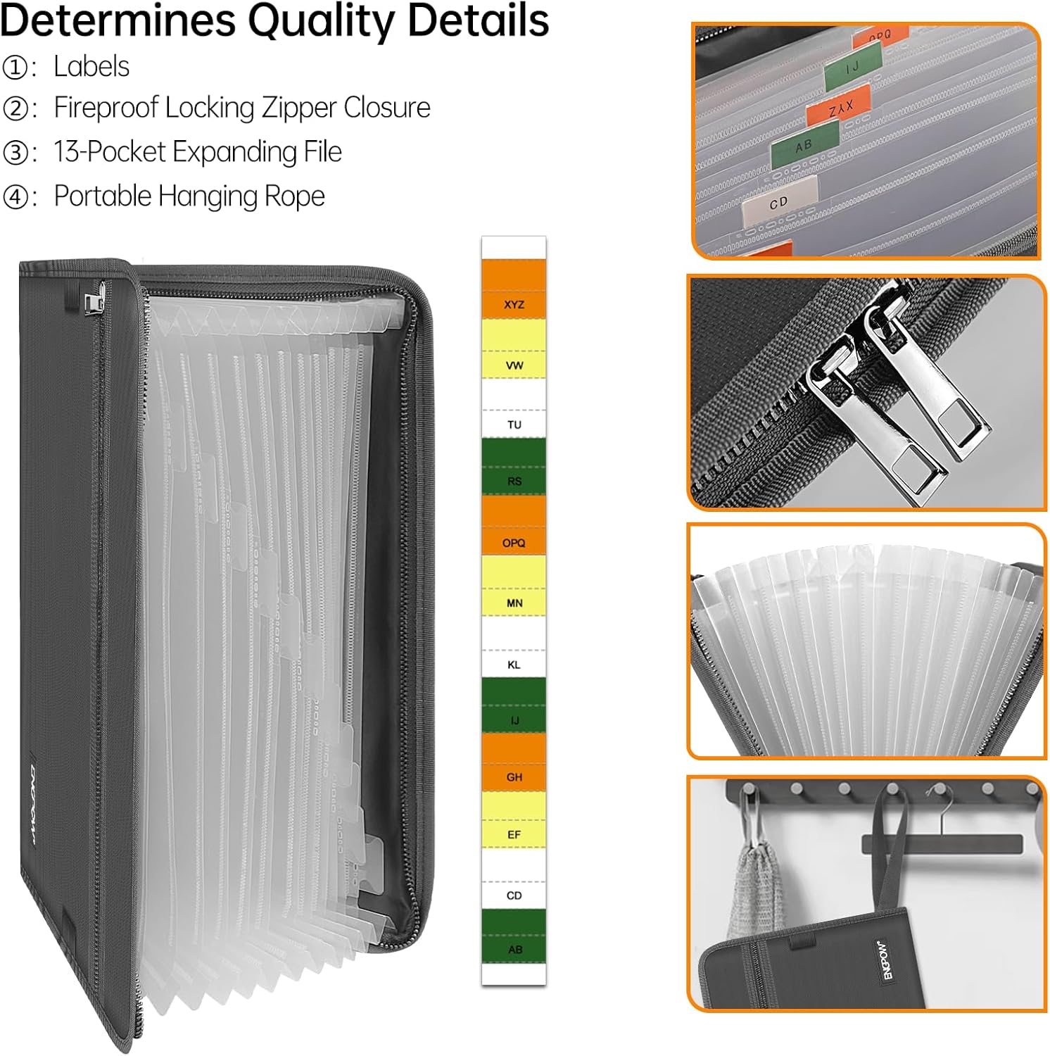 - Innovative Humanized Design: Design with a carrying strap for carrying everything you needed easily. Featuring a double zipper for convenient opening and closing,you won't have to worry about losing any important documents. The included colorful labels make categorizing your files effortless. The fireproof expanding file folder is suitable for business, travel, office, school, home storage, you can be 100% sure that your important documents are in a safe place.