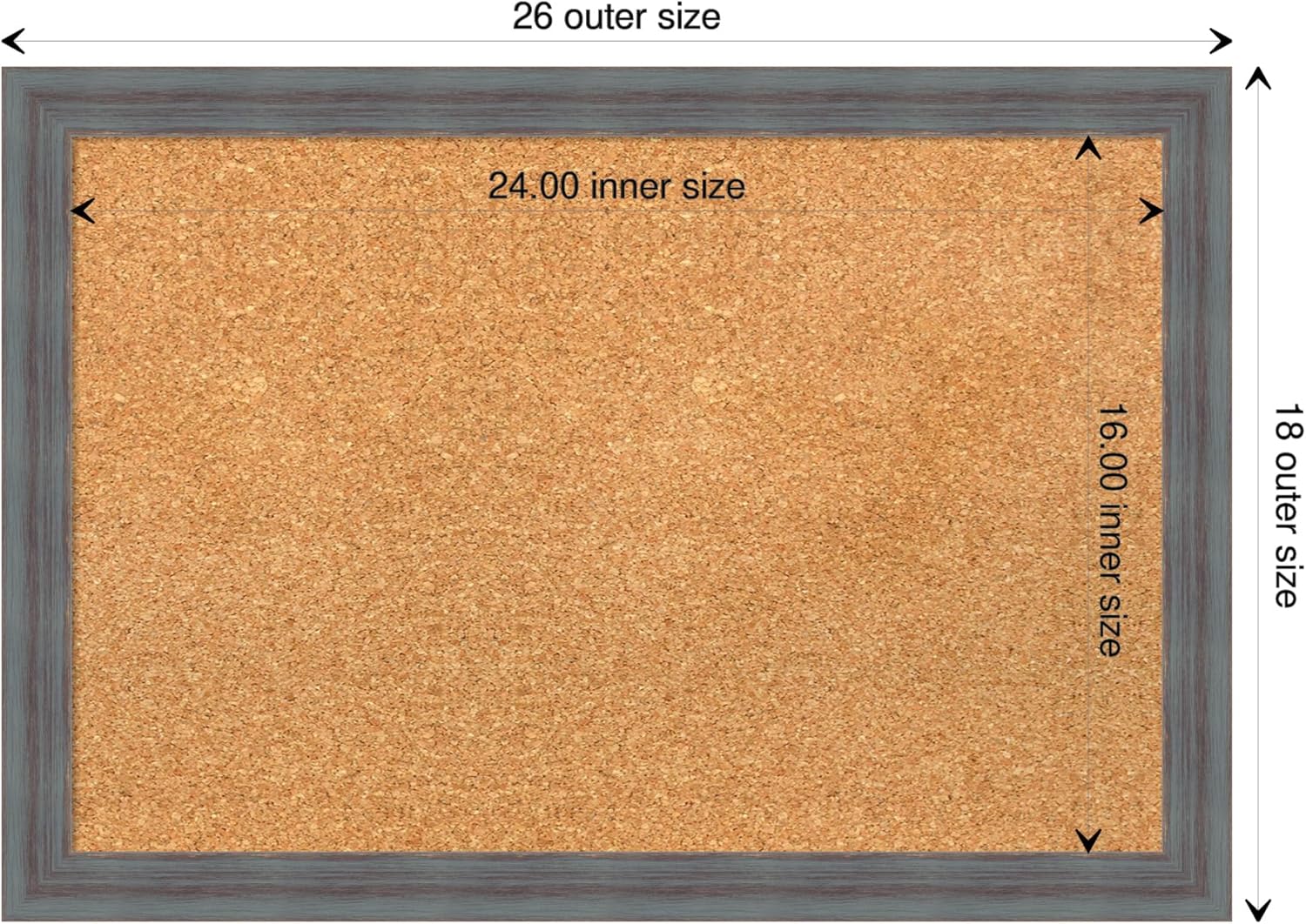- DIMENSIONS: The overall size of this framed corkboard measures 26 in. x 18 in., including the frame. Its functional cork board area measures 24 in. x 16 in.