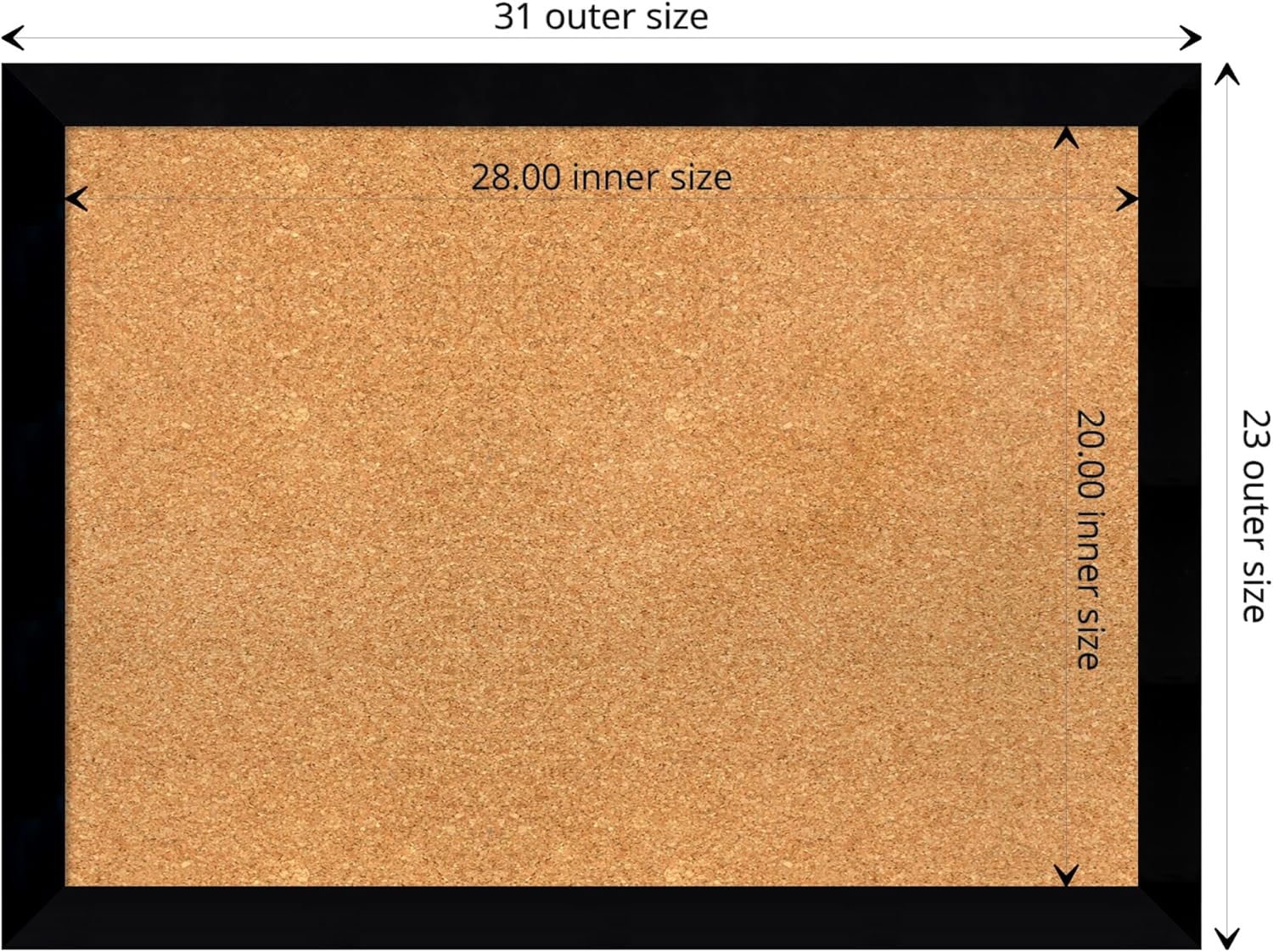 - DIMENSIONS: The overall size of this framed corkboard measures 31 in. x 23 in., including the frame. Its functional cork board area measures 28 in. x 20 in.