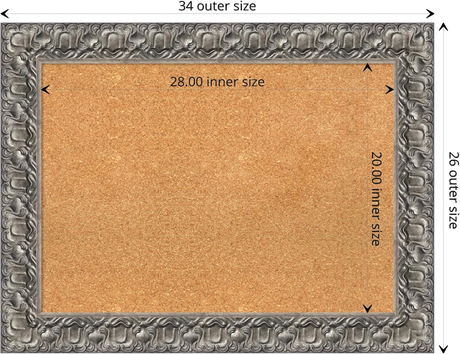 - DIMENSIONS: The overall size of this framed corkboard measures 34 in. x 26 in., including the frame. Its functional cork board area measures 28 in. x 20 in.