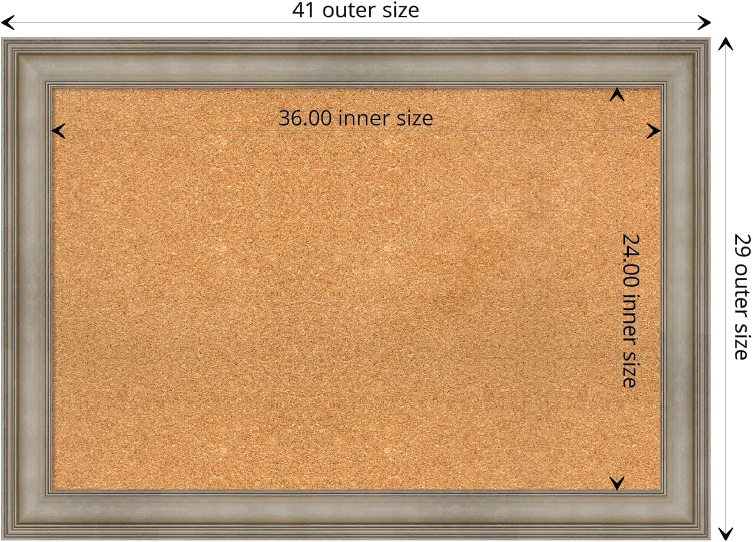- DIMENSIONS: The overall size of this framed corkboard measures 41 in. x 29 in., including the frame. Its functional cork board area measures 36 in. x 24 in.