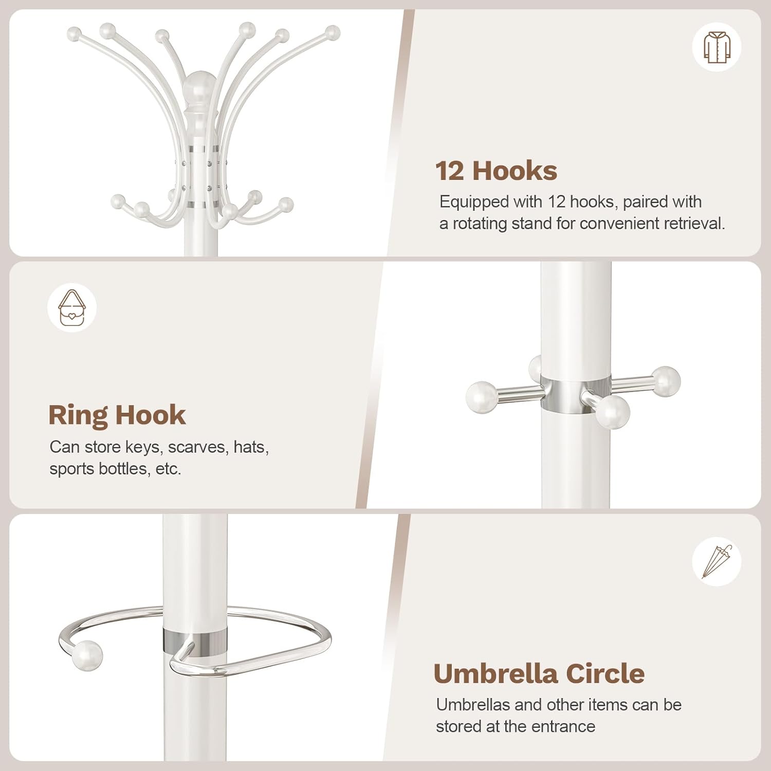 - 16 Hooks and Umbrella Holder: Vilaxing multi-functional coat rack with 16 hooks, and an umbrella holder, which occupies a small area and saves space. Each hook can bear a maximum weight of 15 pounds. The top of the hook has a rounded design to better protect your clothes from damage