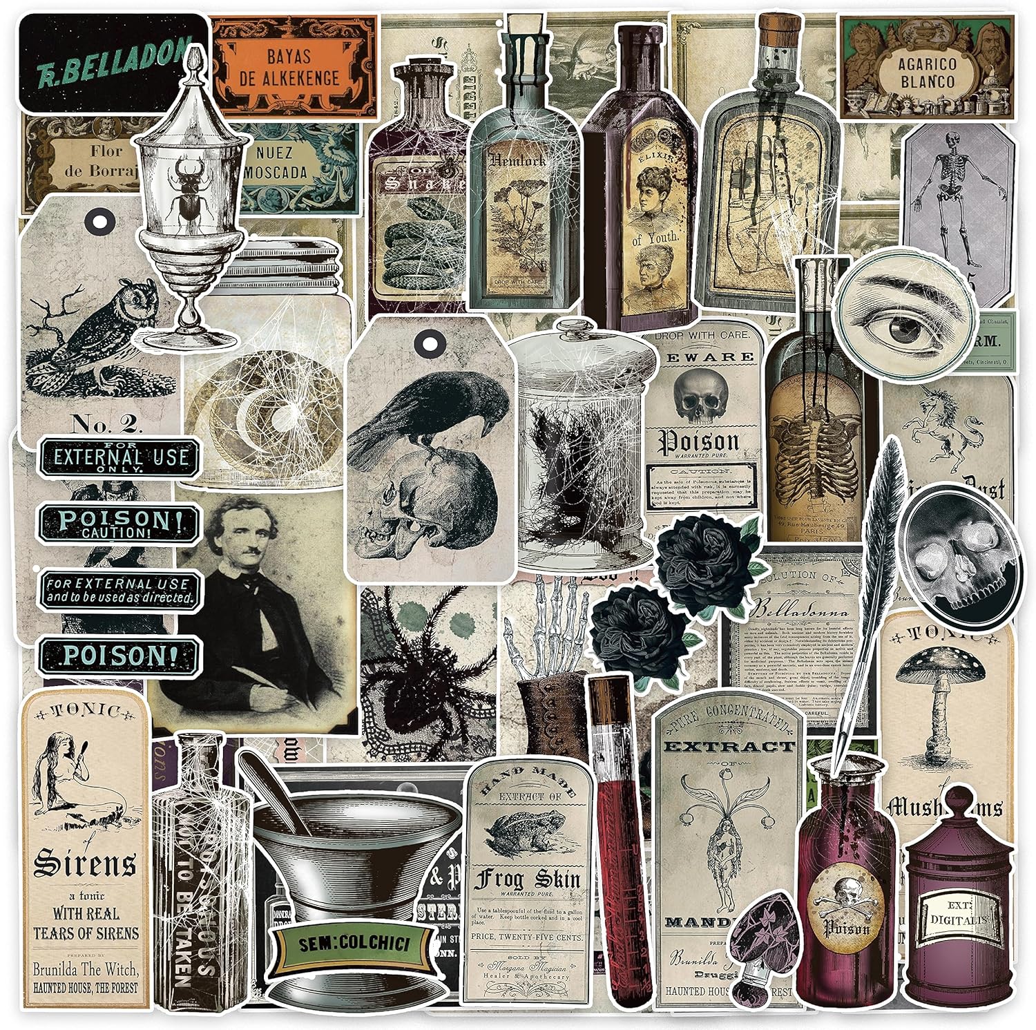 - 2.Diverse Designs: vintage and creepy Halloween theme sticker pack showcasing scary and mysterious elements,such as bottles of snake wine,skeleton and crow,owl,spiders,skeletons,poisons and potion labels tags.Perfect for making dark aesthetic scrapbooks or Halloween decoration.