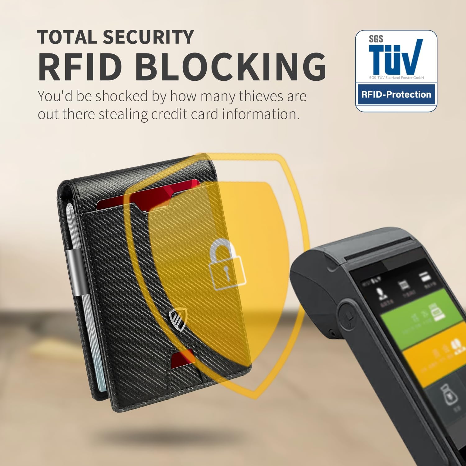 - RFID Blocking Protection - This rfid wallet for men is tested by an independent German quality control institute, specifically to block 13.56 MHz or higher RFID signals and protect against data theft by RFID scanners