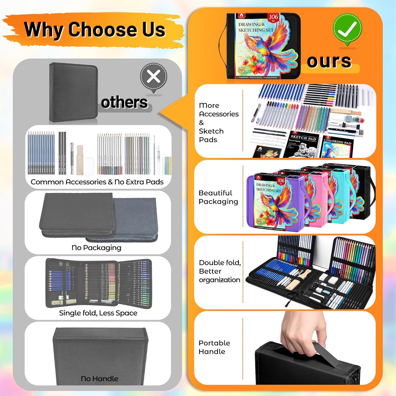 - 106 PCS Professional Drawing Kit Sketching Supplies: All you need are in this portable art case whether you are a professional or a beginner. It includes all the art supplies, specially added 3-color sketchbook and coloring book. Perfect for drawing, sketching, shading, blending, layering and adult coloring books. With our professional drawing supplies kits, let your imagination flow and bring your ideas to your artistic journey
