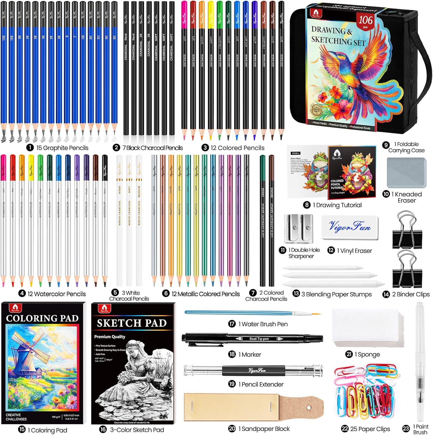 - High Quality Artist Drawing Set: This Premium art set includes 15 graphite pencils, 12 watercolor pencils, 12 metallic color pencils, 12 colored pencils, 7 black & 3 white charcoal pencils, 2 colored charcoal pencils, 3-COLOR sketch pad, coloring book, tutorial, 25 paper clips and more accessories. These help artists explore different styles and experiment with various techniques, fostering creativity and pushing their artistic boundaries. Elevate your artwork with the finest drawing pencils