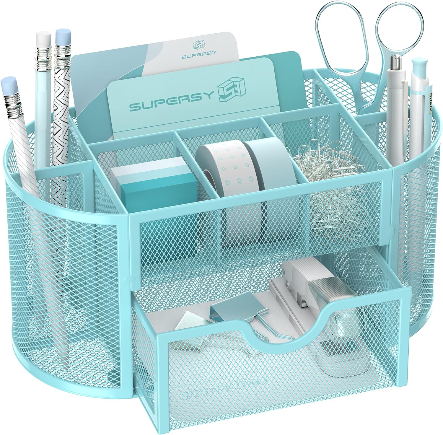 SUPEASY Mesh Desk Organizer, Desk Accessories & Workspace Organizers with Drawers, Pencil Holder for Desk with 9 Compartments for Office Suppliess, 8.6 x 4.3 x 4.1 Inch, Blue