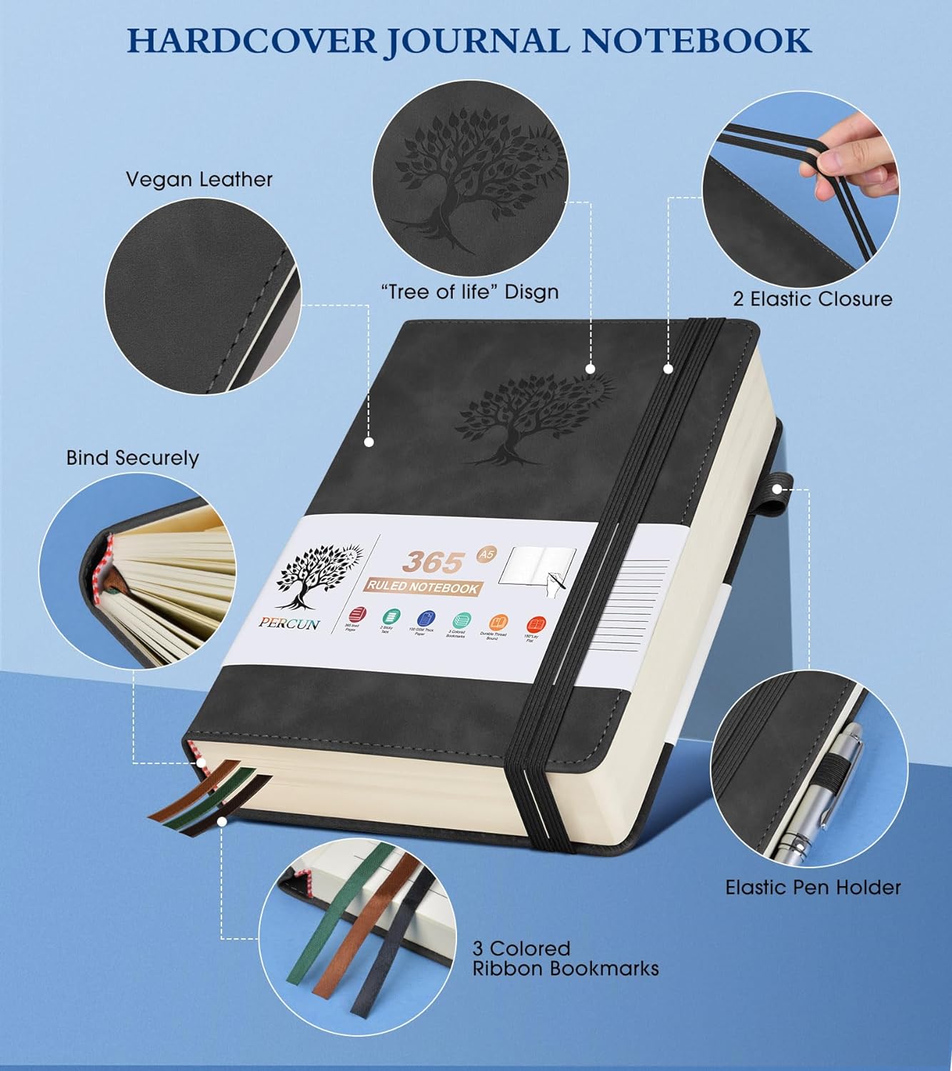 - 【180°Lay Flat for Writing】Our notebook also comes with 180°Lay Flat Journal Notebook, which makes writing a breeze. The elastic pen holder and bookmark ensure that you never lose track of your pen, and the 2 elastic closures ensure that your journal stays securely closed. The 3 colored ribbon bookmarks and 3 sticky labels provide even more ways to customize your journal to your liking.Built-in back pocket that is great for storing loose notes, cards, or other important items.