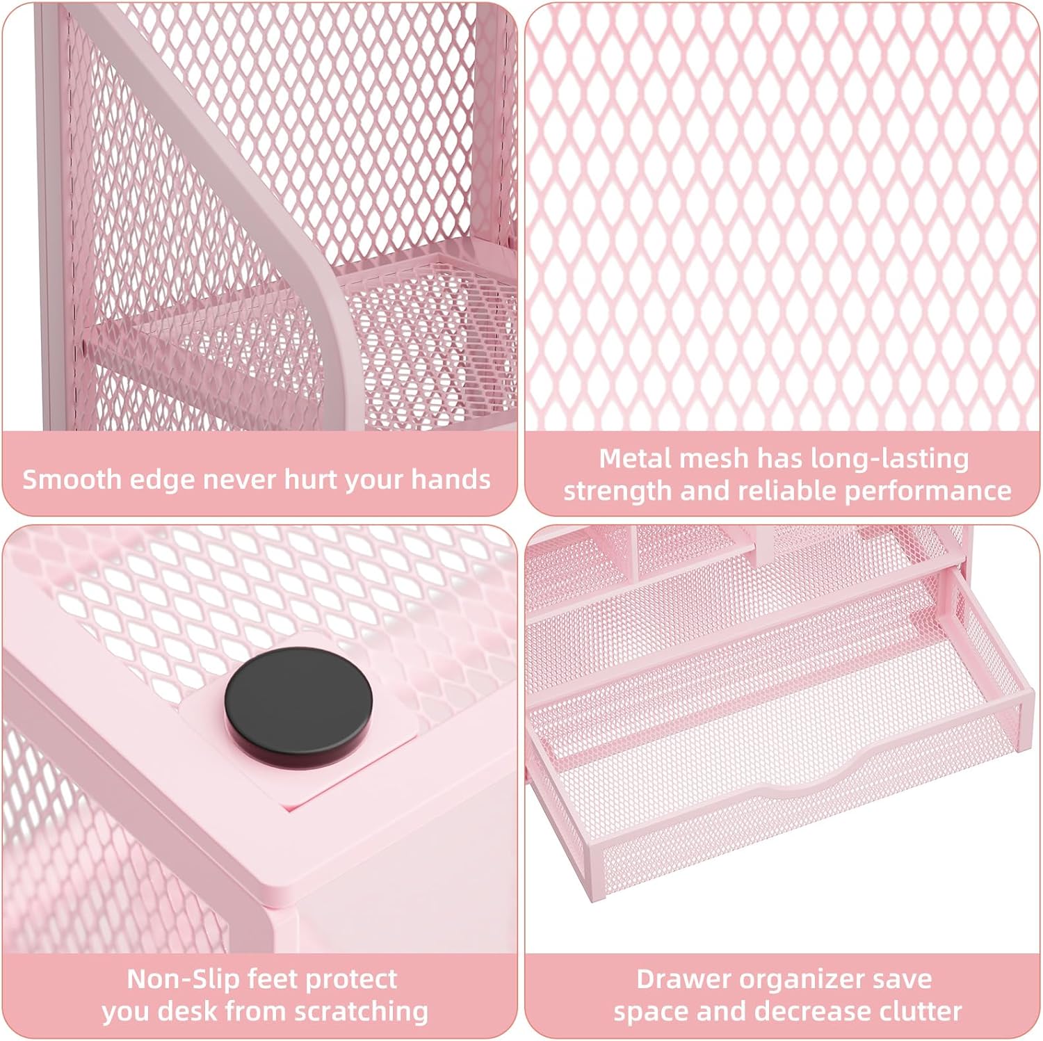 Marbrasse Mesh Desk Organizer with Drawer, Multi-Functional Pencil Organizer, 12 Compartments, Pink, Modern, Minimalist
