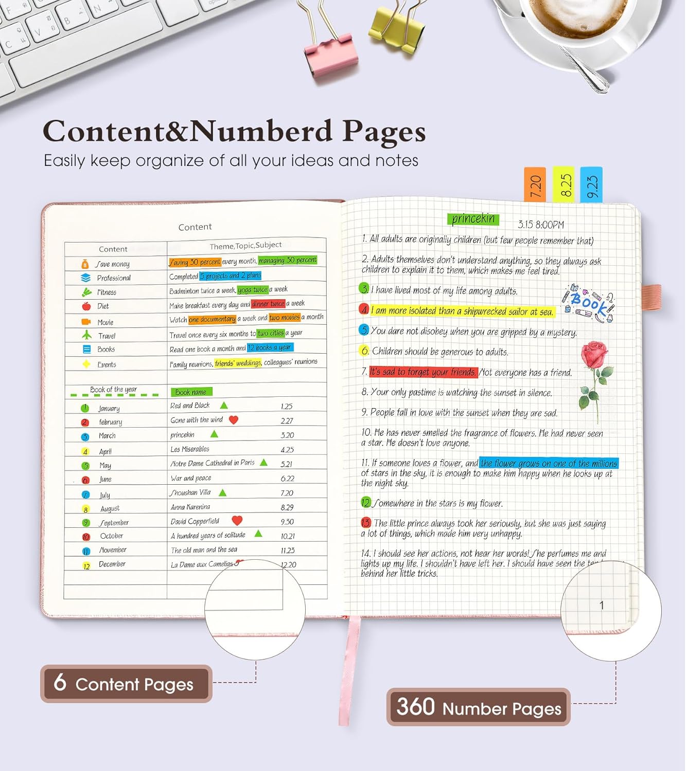 - 【Humanized Design】 ❶ 360 numbered pages, 6 contents pages, you can easily keep organize of all your ideas and notes.❷2 Divider sticky notes, 2 Bookmarks to help you find important content faster..❸ Back Inner pocket can holds notes, business cards, small gadgets, etc. ❹ Closes with an elastic band, Pen holder loop for any pen.