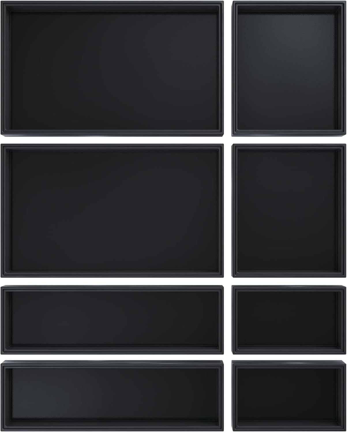 Bathroom Drawer Organizer Trays, Bamboo Drawer Organizer Kitchen Utensils Silverware Organizer, 8 PCS Wood Box Stackable Bins for Makeup, Office Desk, Junk Drawer (Black)