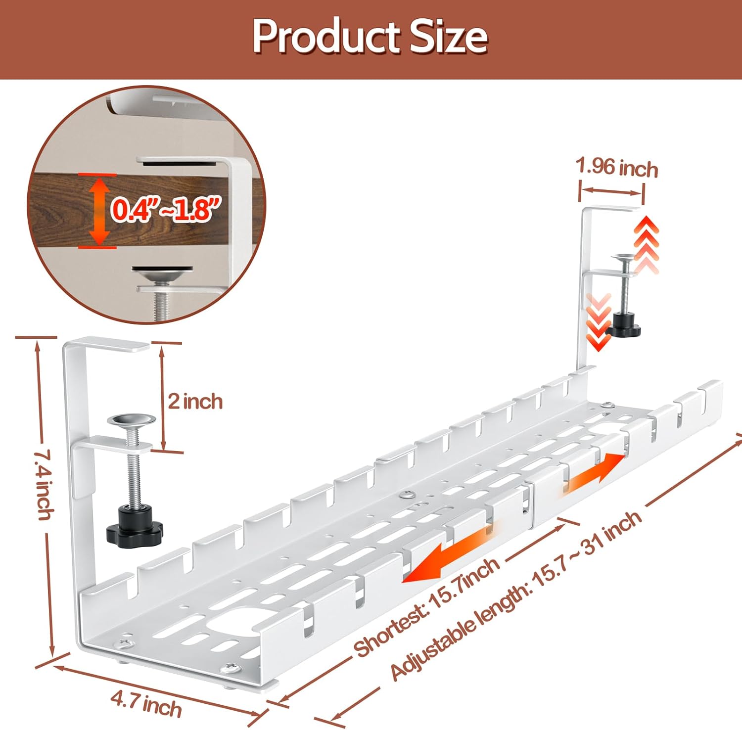 Shikha Cable Management Under Desk, 15.7"-31" Retractable Cable Management Tray, No Drilling Cord Organizer with Clamp for Desk, Under Table Wire Management Tray for Home Office -White