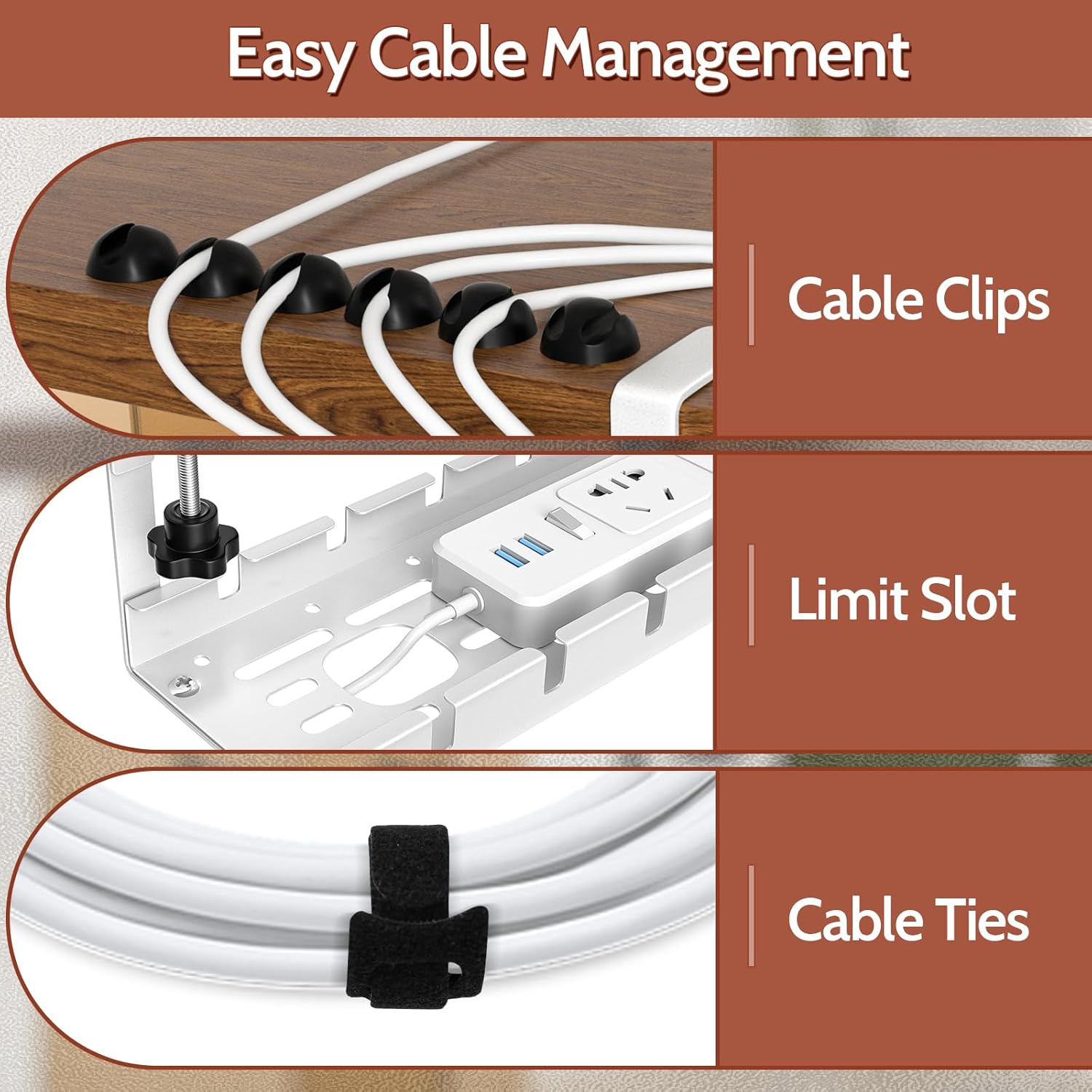 - 【Space Saving】Still putting up with a cluttered and hard-to-clean desktop? Improve the current bad situation by choosing this adjustable, no-drill, easy-to-install and remove under desk cable management. C-clamps with adhesive anti-friction pad are used to hold it in place, eliminating the need for drilling and avoiding damage to the desk.