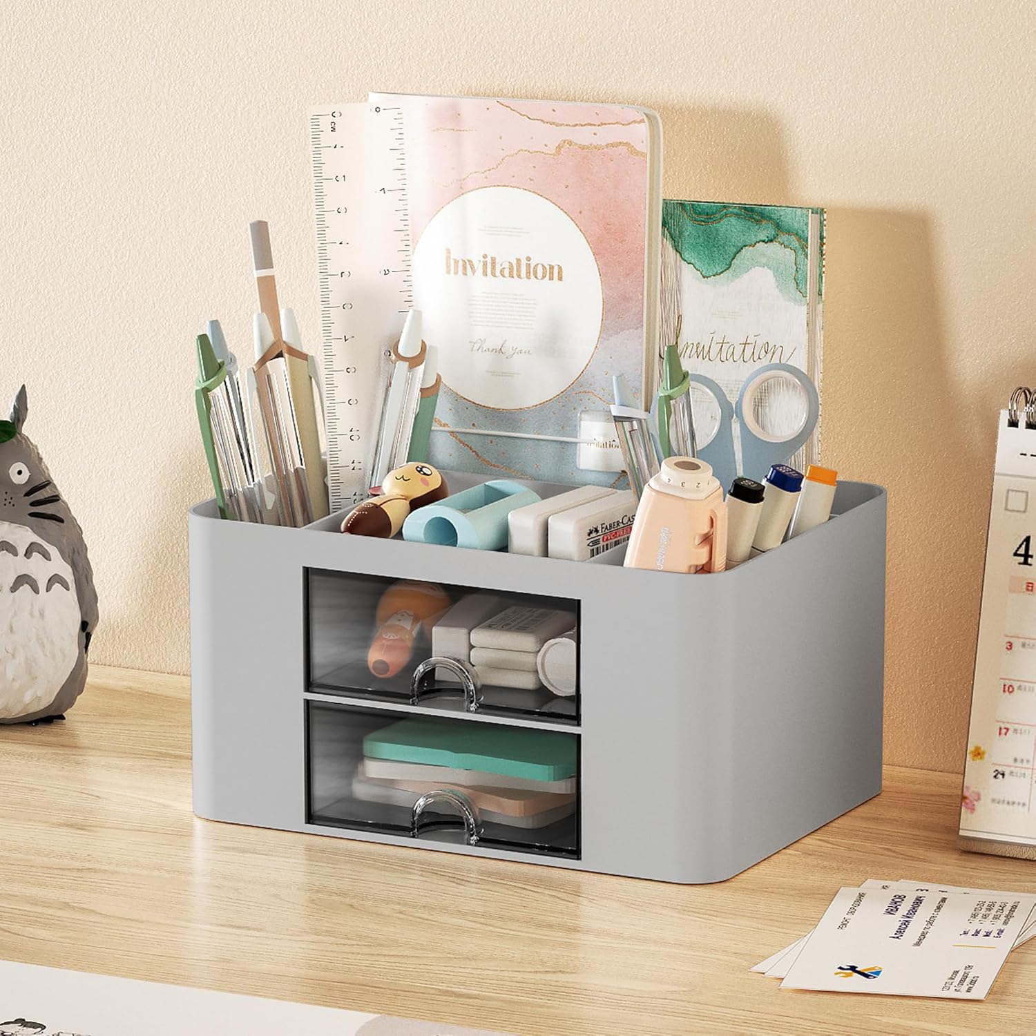 Marbrasse Pen Organizer with 2 Drawer, Multi-Functional Pencil Holder for Desk, Desk Organizers and Accessories with 5 Compartments + Drawer for Office Art Supplies (Grey)
