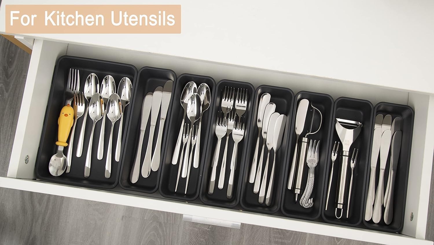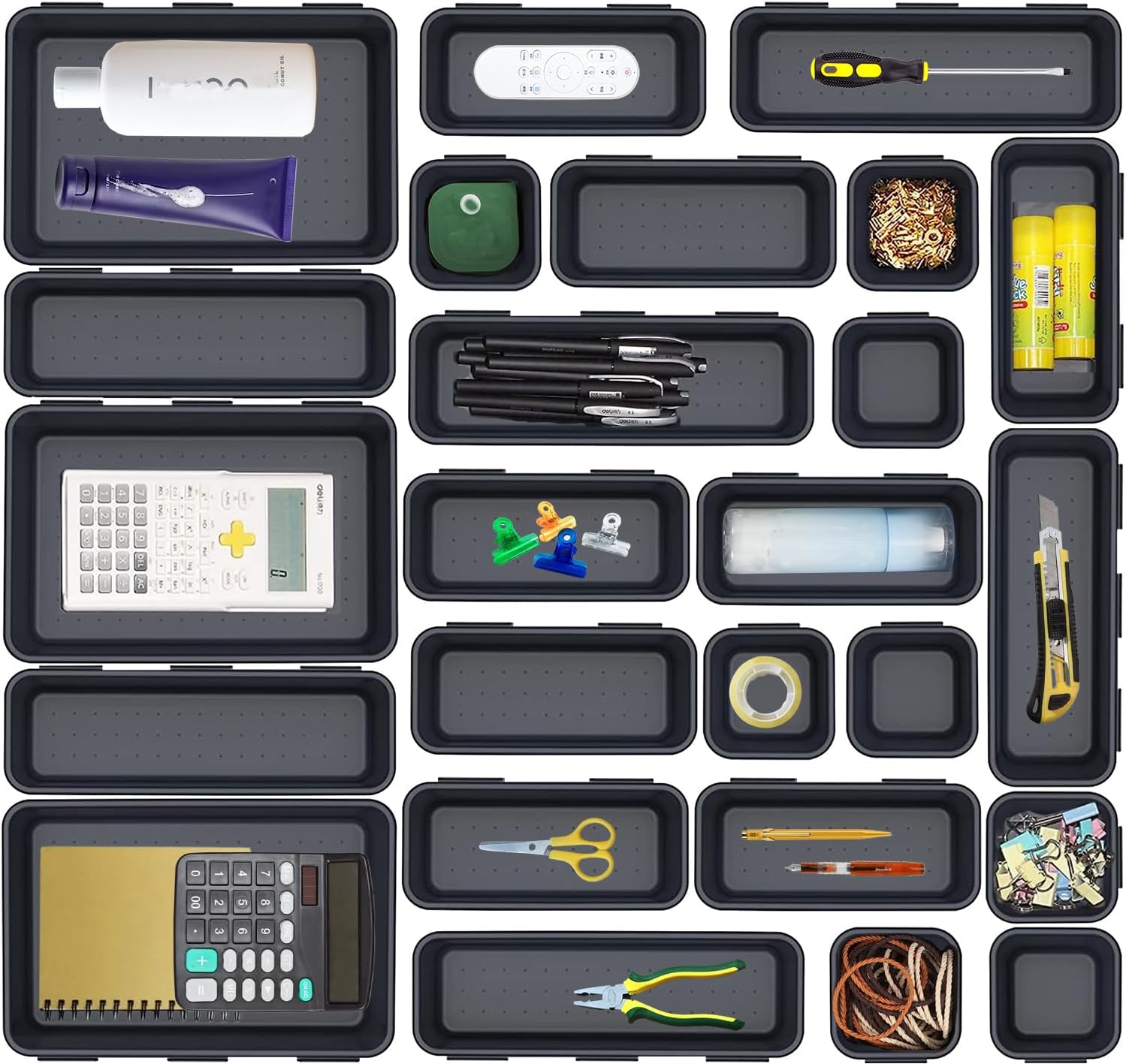 - 【25Pcs & 4 Sizes】The organizer trays can be stacked or interlocked together , or each one works alone.Set includes:3 Pack *( 9.2 L x 6 W x 1.8 H in), 6 Pack* ( 9.2 L x 3 W x 1.8 H in), 8 Pack* ( 3 L x 3 W x 1.8 H in),8 Pack* ( 6 L x 3 W x 1.8 H in).Suitable for various sizes of drawers and desk storage.