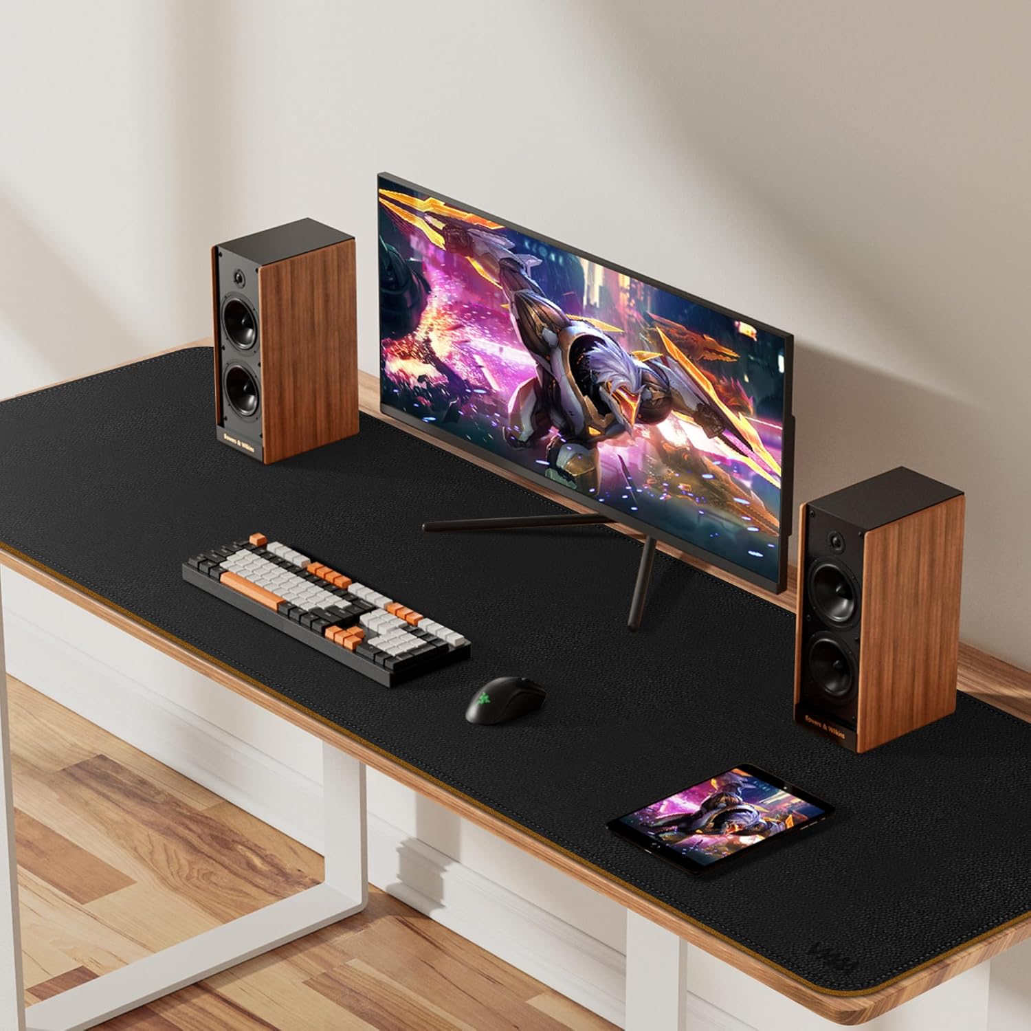 - Dual-Sided Leather: Black PU leather desk pad both sides can be used. The 40cm wide desk mat has a smooth surface and is perfect for mouse use. Leather desk pad provide soft cushioning to reduce wrist and elbow stress while working.